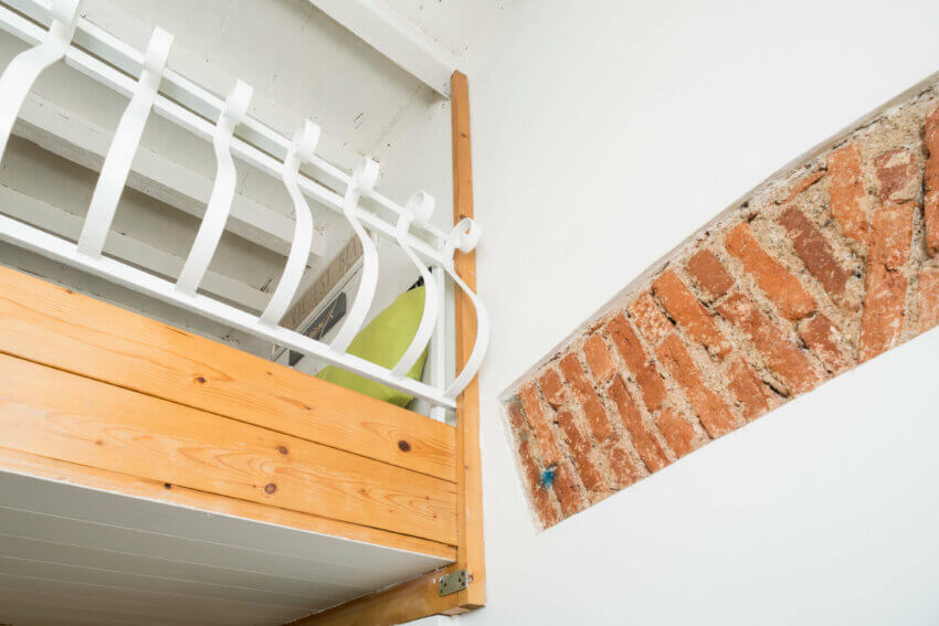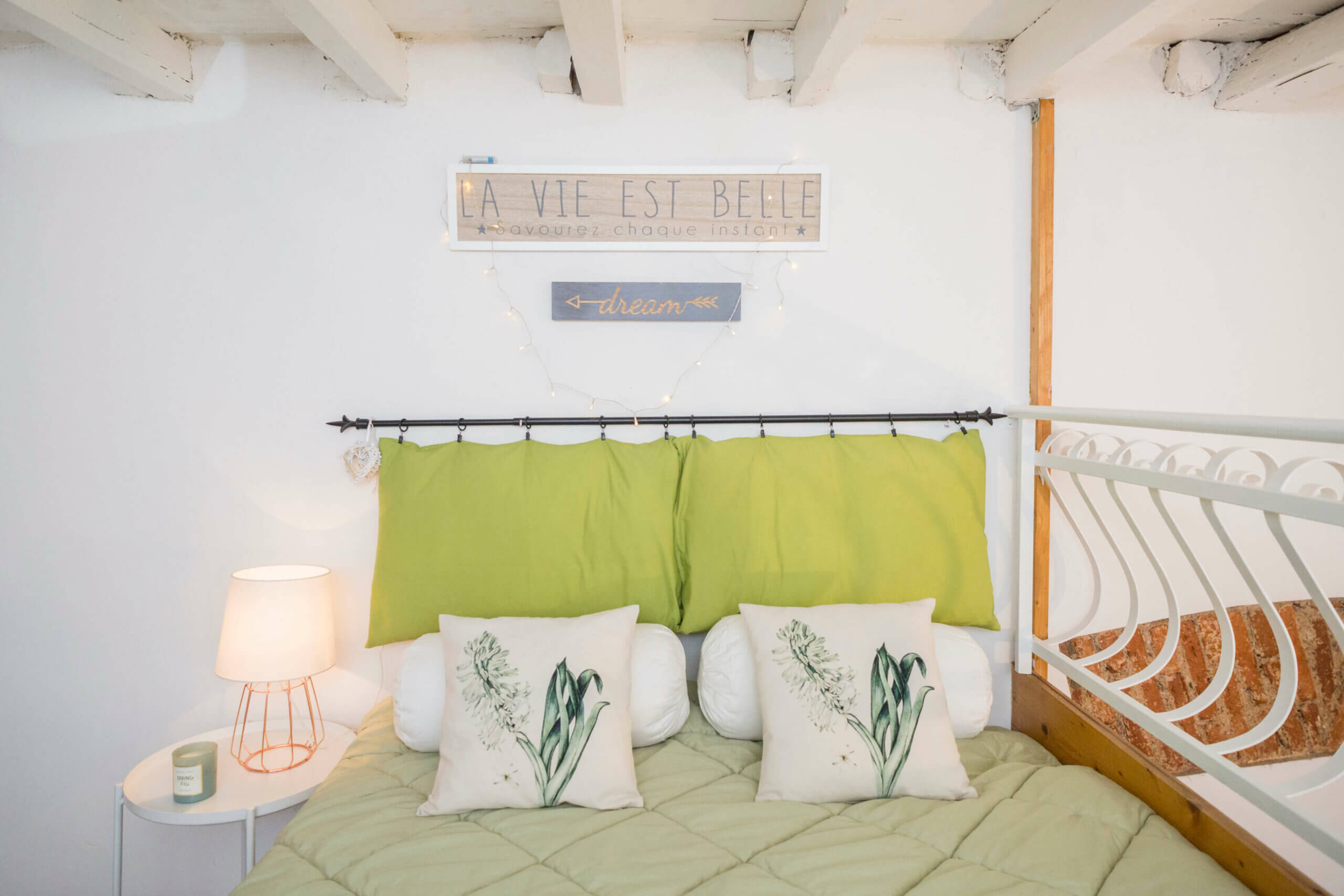 L’altezza del soffitto e il bianco delle travi in legno a vista conferiscono luminosità agli spazi.