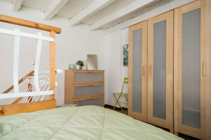 Infine c’è una zona notte separata con il letto a una piazza e mezzo e le armadiature.