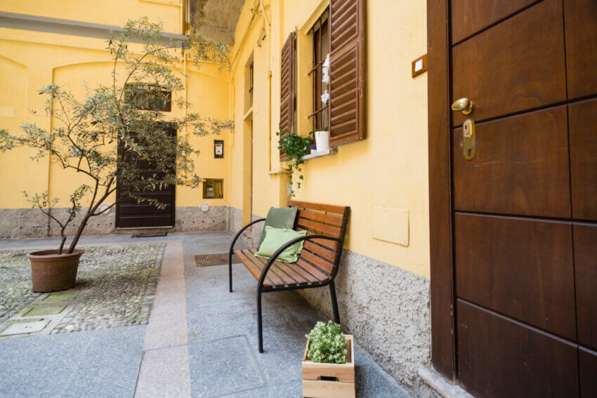 All’esterno una panchina e il verde delle piante rendono accogliente l’ingresso.