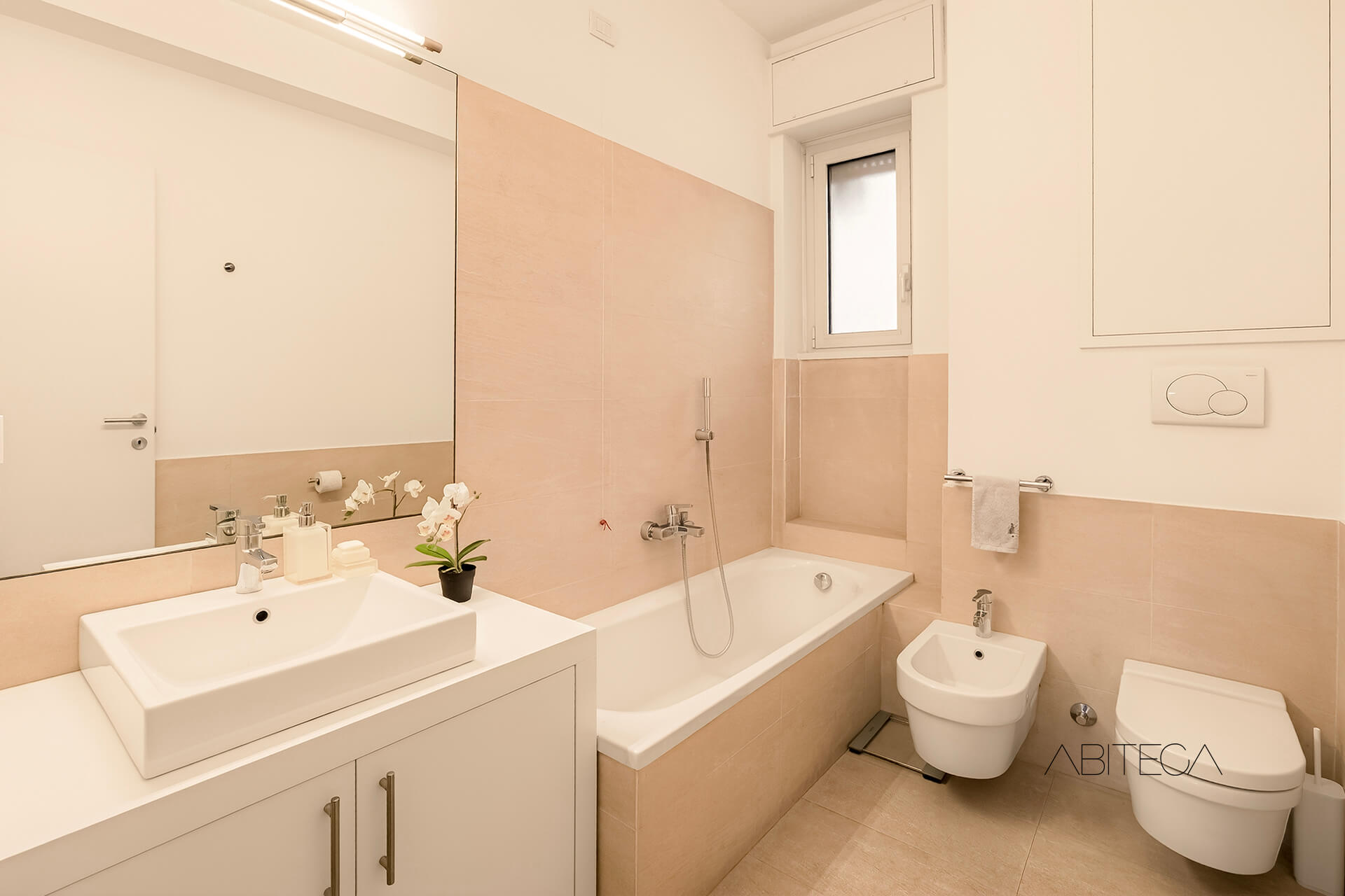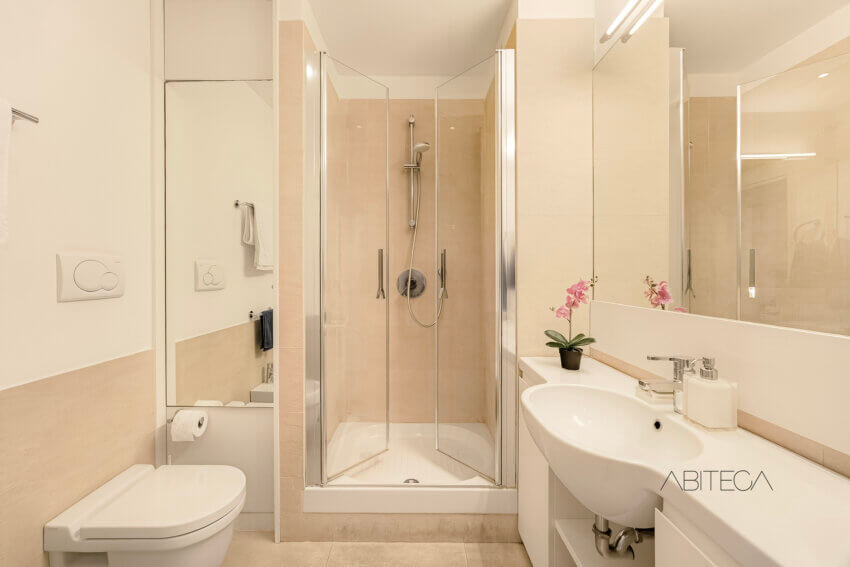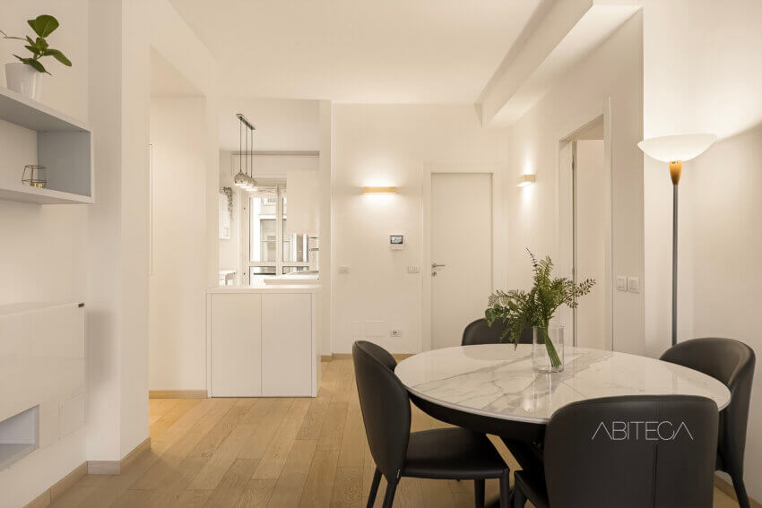 Il dettaglio che distingue questo appartamento dalle altre proposte in affitto è l’approccio alla ristrutturazione: questa casa è stata rinnovata e arredata con l’intento di essere abitata, non di essere messa a reddito. Lo si percepisce nella scelta dei materiali, eleganti e moderni, nella cucina pensata per cucinare davvero, nelle armadiature disegnate per contenere la vita quotidiana senza compromessi estetici. Chi entra trova un ambiente già funzionante, dove non manca niente e niente è superfluo.