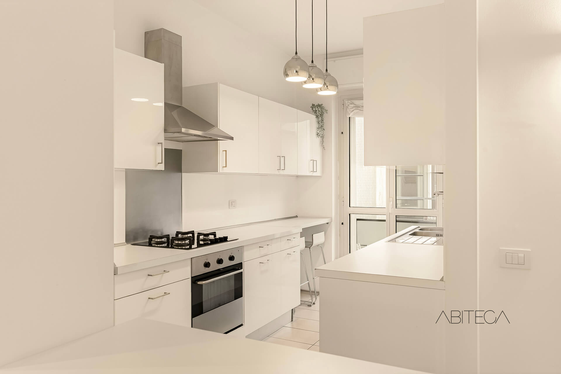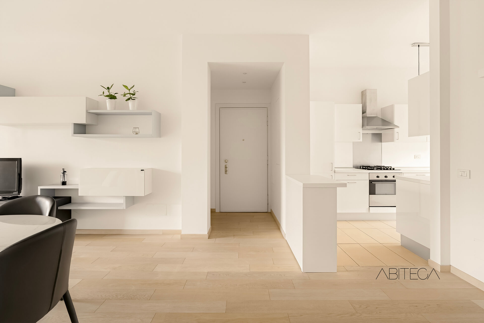 Varcato l’ingresso, si apprezza subito un piacevole effetto di volumi e profondità, grazie alla zona giorno che si sviluppa da un affaccio all’altro della casa.