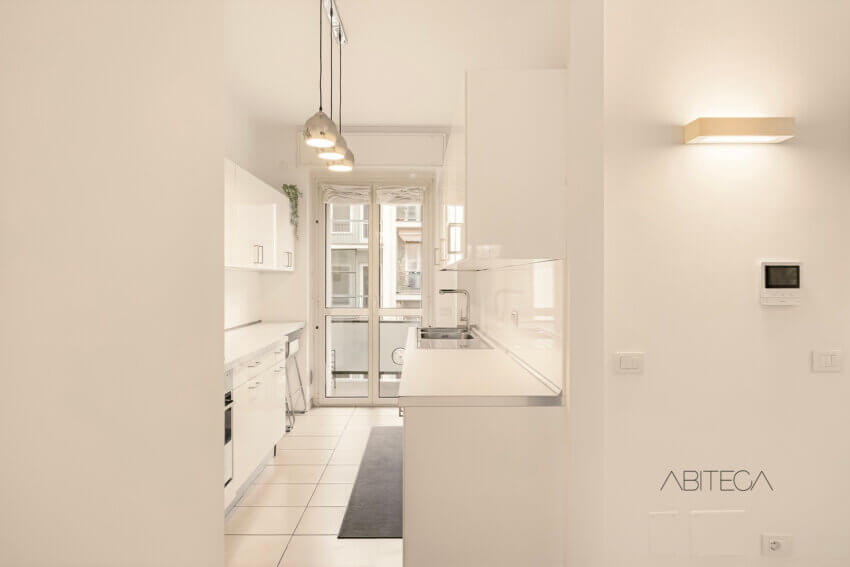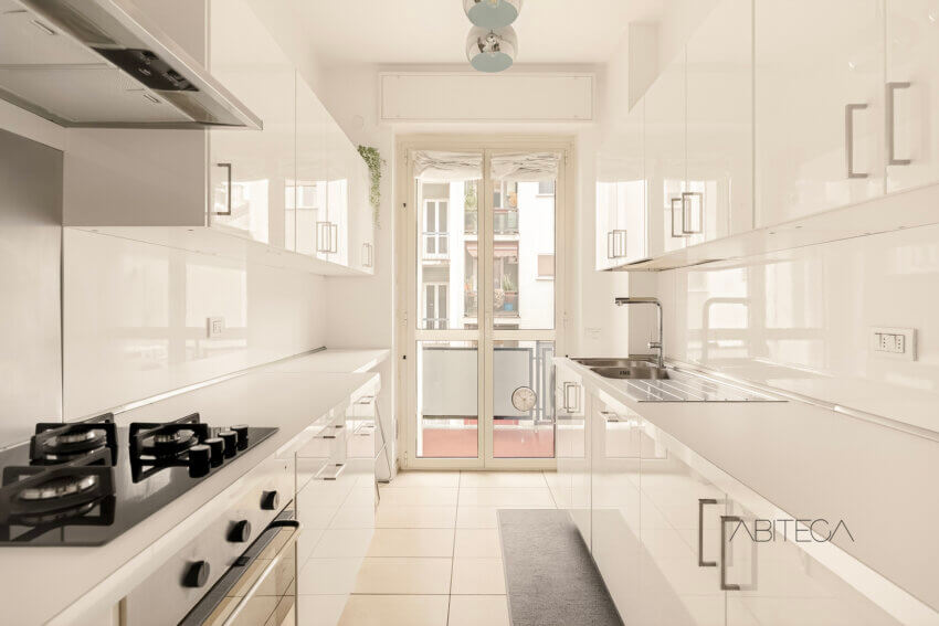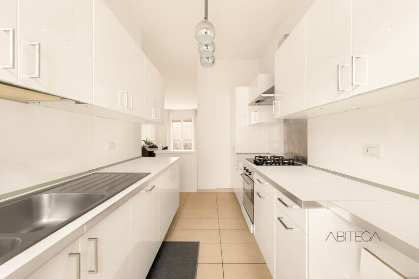 Dal lato opposto si sviluppa la cucina, davvero comoda, con l’arredo lungo le due pareti fino alla porta finestra del secondo balcone, più di servizio, dove trova posto anche la lavatrice.