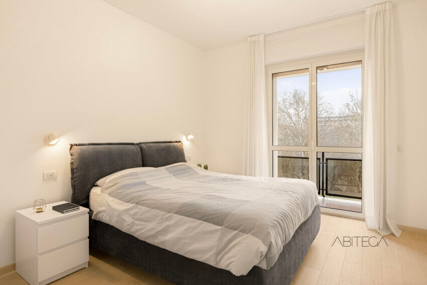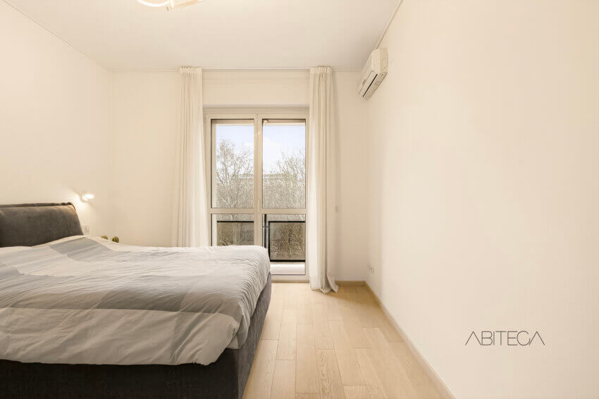 La camera matrimoniale principale è spaziosa, con armadiature a tutta altezza e un terzo balcone, anche questo con una piacevole vista sugli alberi.