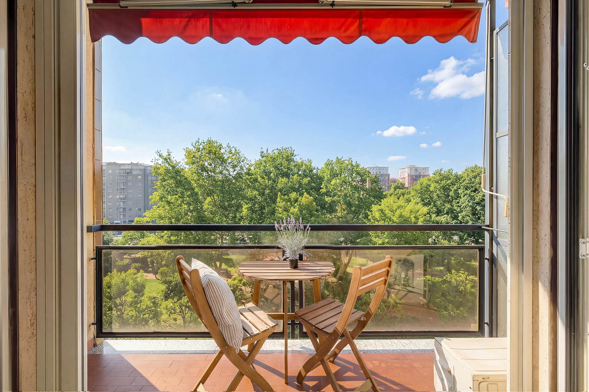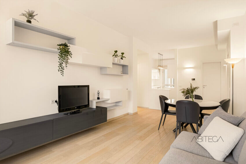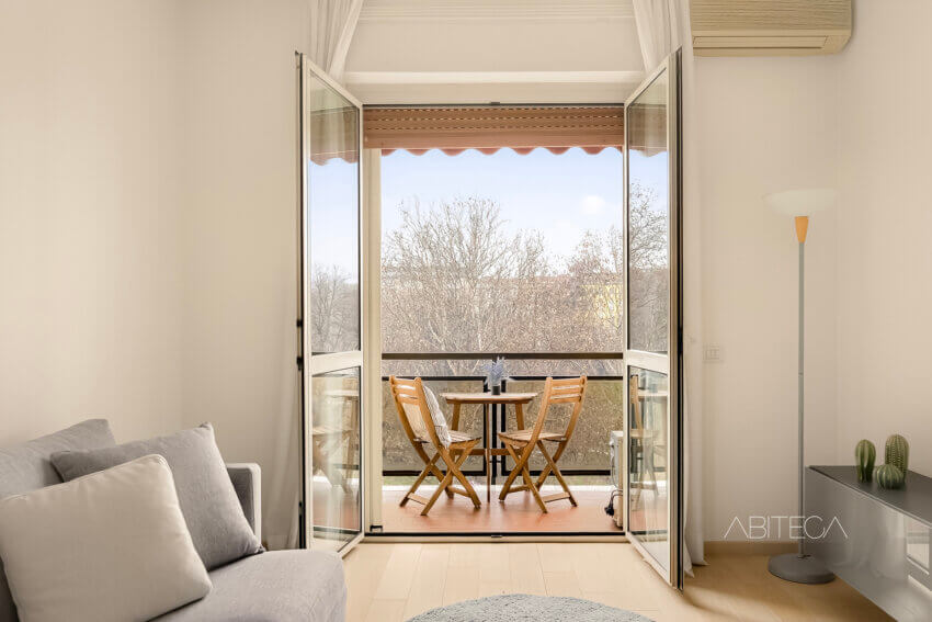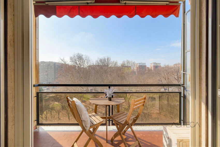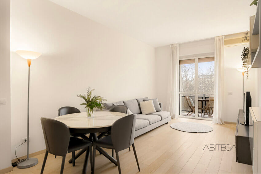 Da un lato c’è il soggiorno, con una parte dedicata al grande divano con parete TV, e una parte dedicata al tavolo da pranzo. In fondo c’è la porta finestra con il primo balcone della casa (ce ne sono ben 3): uno spazio esterno dove è possibile collocare un tavolino e godersi la vista libera sulle chiome degli alberi nei pomeriggi di primavera, estate e autunno.