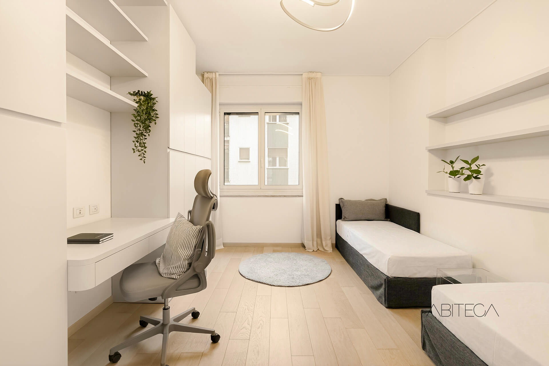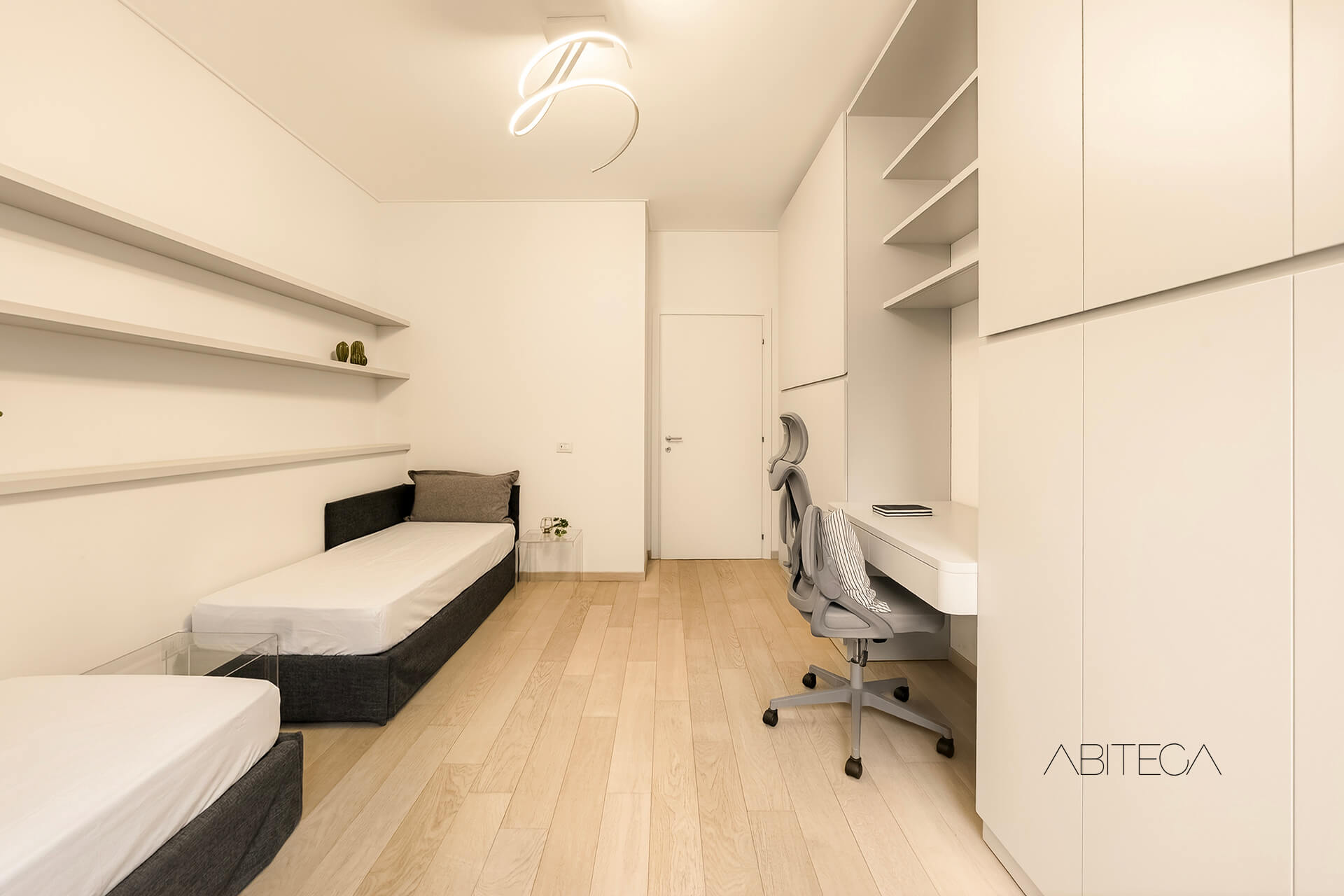 La seconda camera si sviluppa in lunghezza e offre così lo spazio per un angolo studio con scrivania, due letti e una libreria.