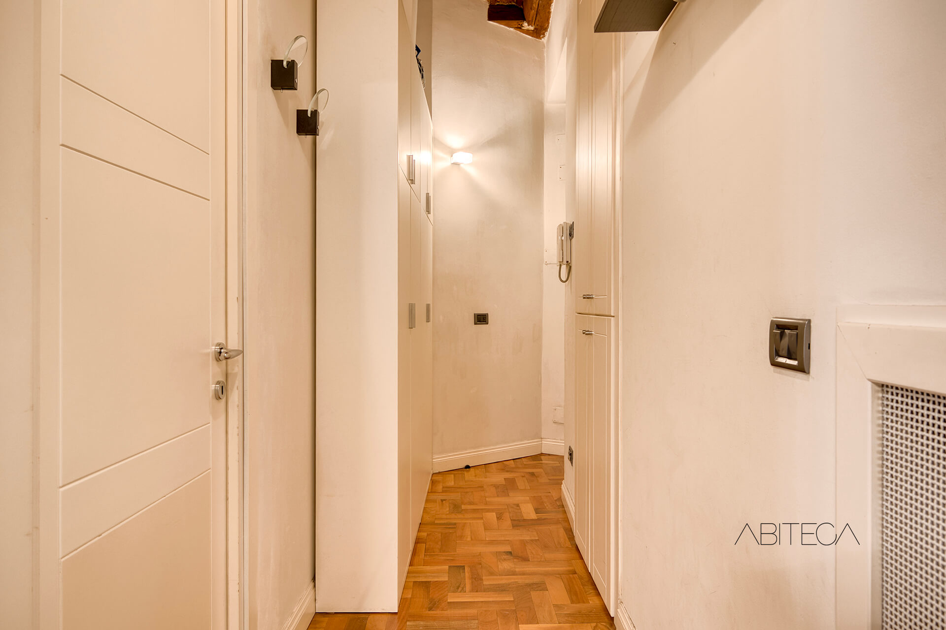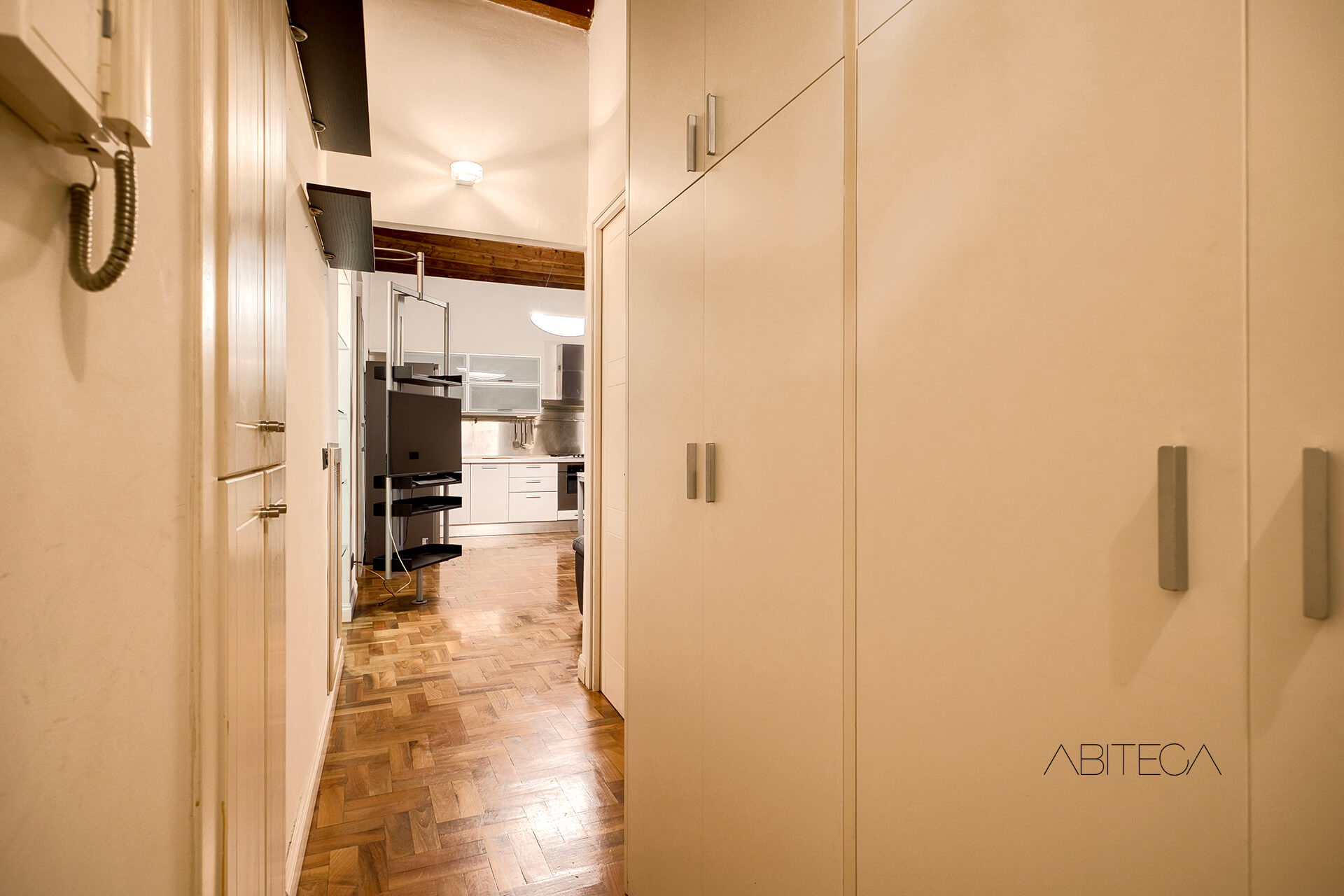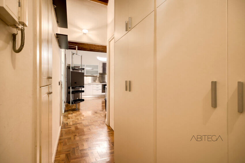 All’ingresso è presente una parete attrezzata con armadi, molto funzionale, che sfrutta tutto il corridoio d’ingresso come spazio contenitivo.