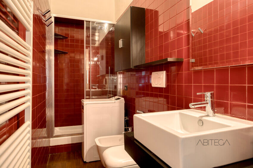 Il bagno è completo di lavatrice e di un box doccia ampio e confortevole, ben al di sopra degli standard abituali di un bilocale.