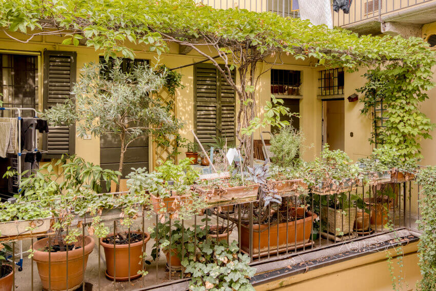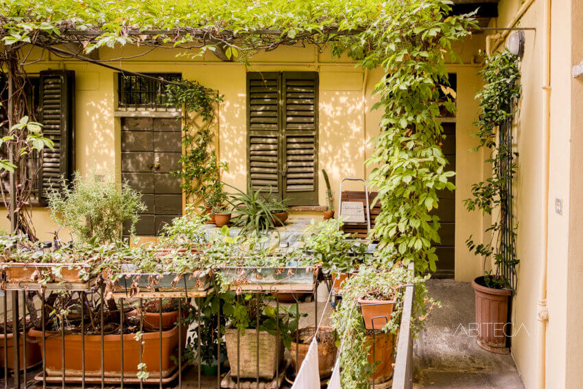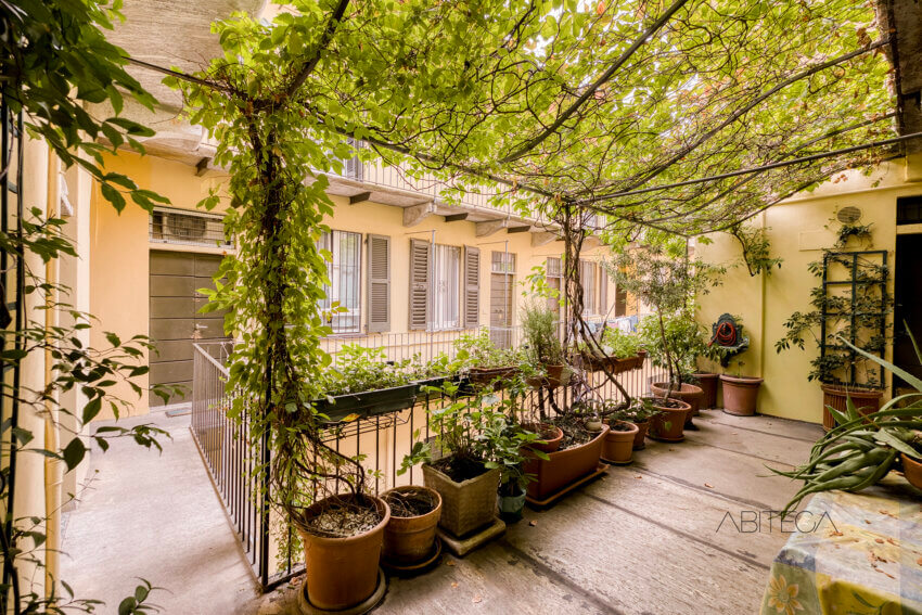 Si percorre un ballatoio che si estende fino a diventare un terrazzo piantumato, condiviso con poche altre abitazioni. È come un piccolo giardino sospeso, curato e piacevole da percorrere ogni giorno prima di entrare in casa.