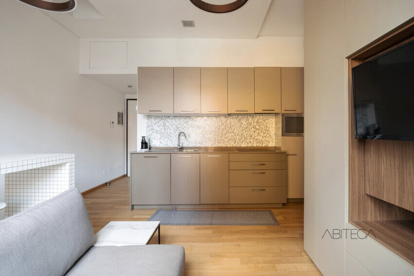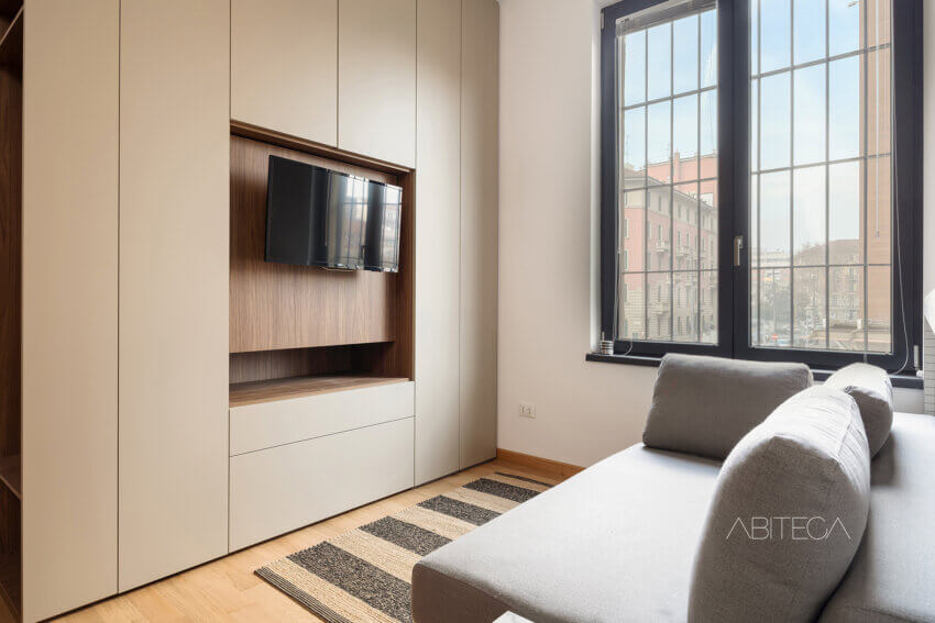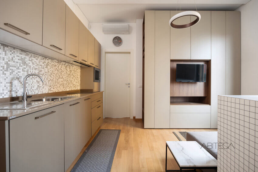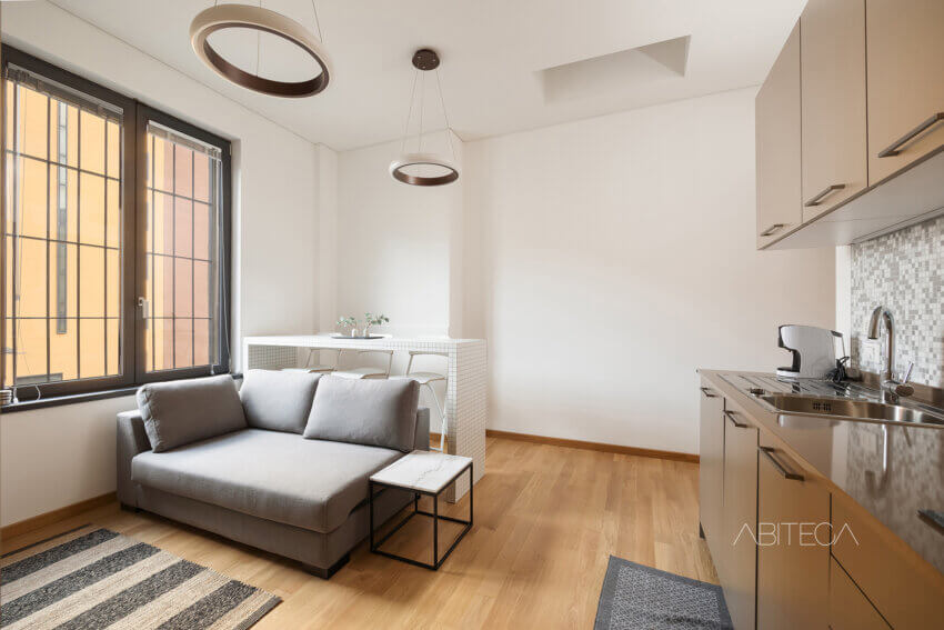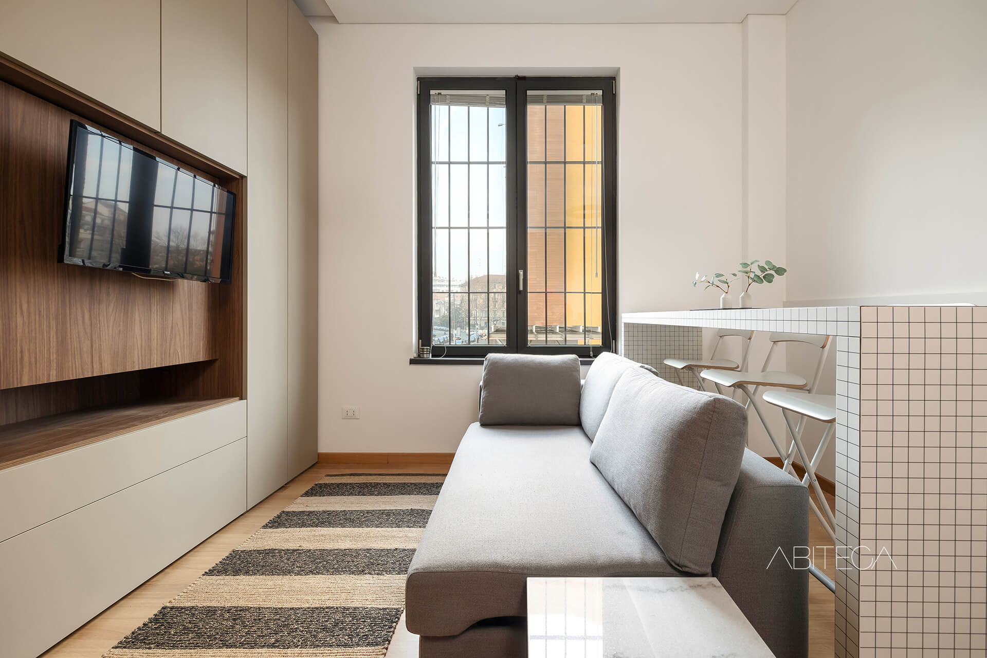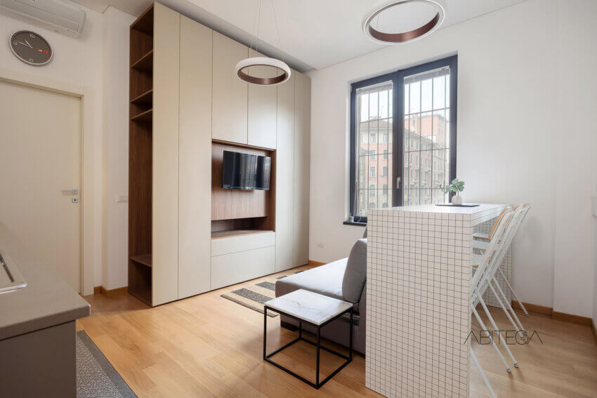 Nel bilocale gli spazi sono ben studiati per sfruttare al meglio la metratura, e in particolare gli arredi mostrano una cura per i dettagli che rende questi ambienti sofisticati e accoglienti.