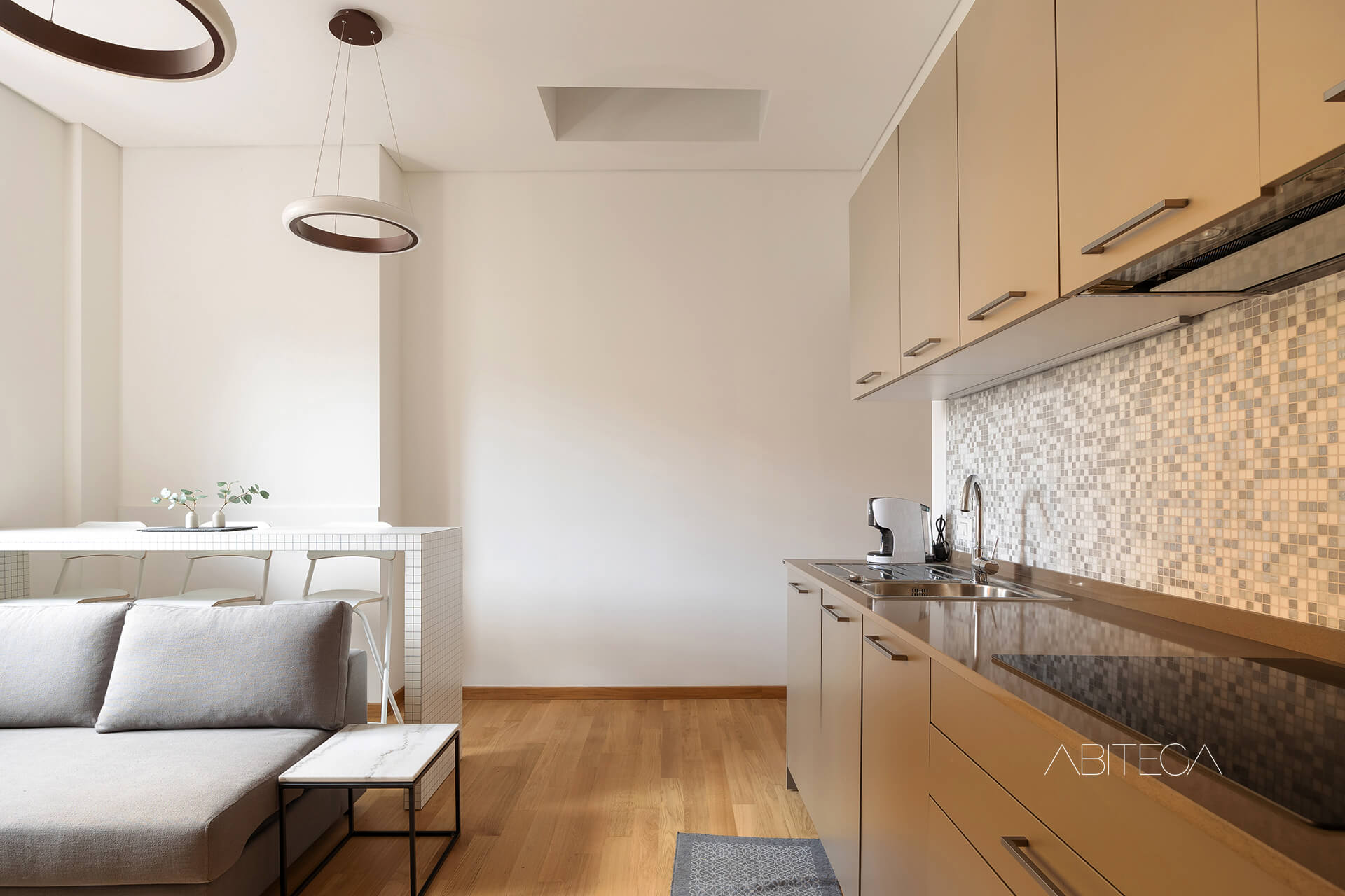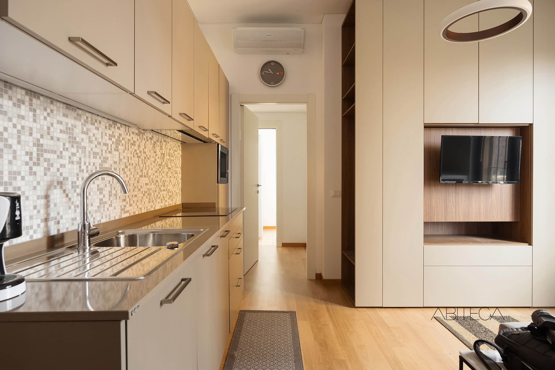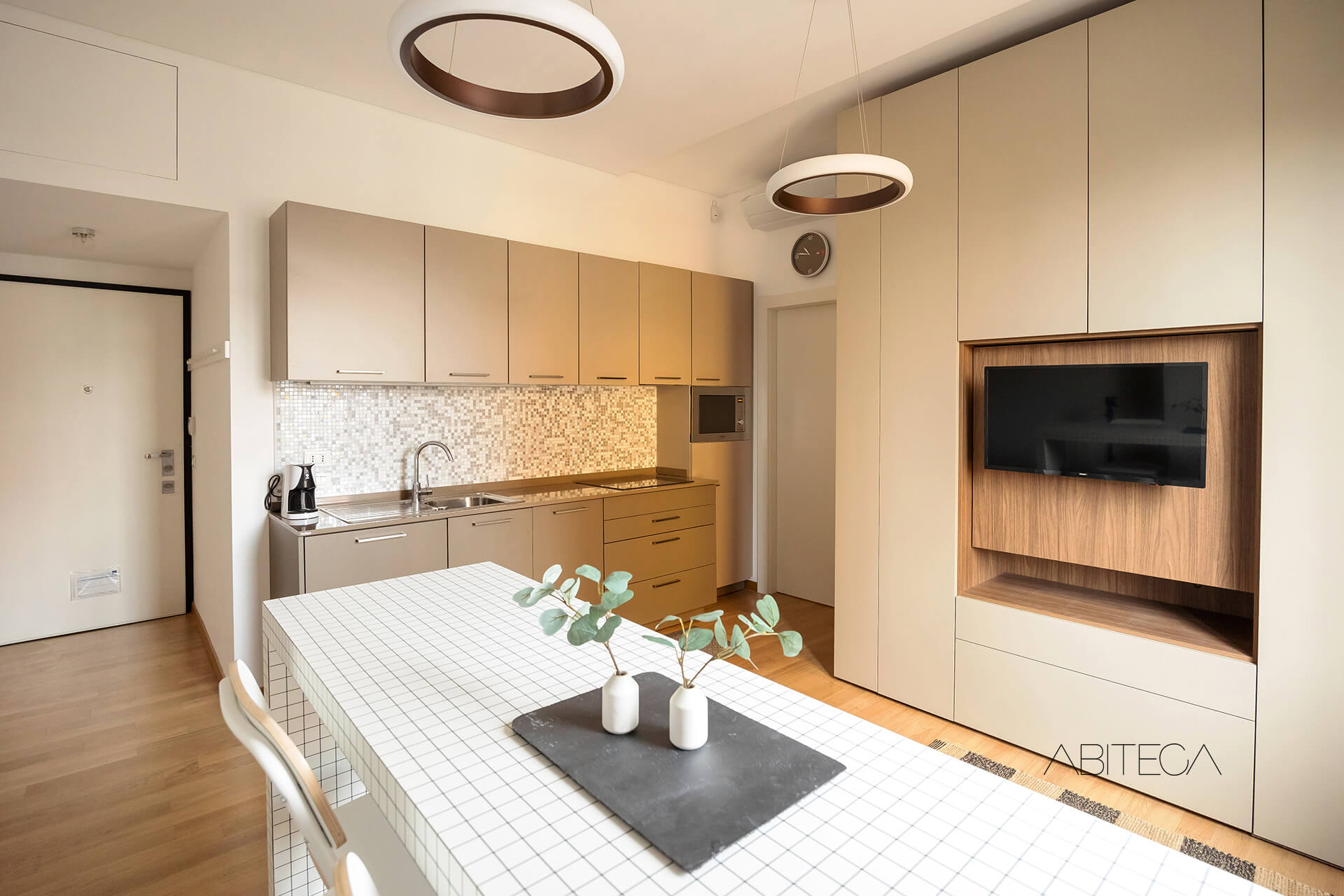 Nel bilocale gli spazi sono ben studiati per sfruttare al meglio la metratura, e in particolare gli arredi mostrano una cura per i dettagli che rende questi ambienti sofisticati e accoglienti.