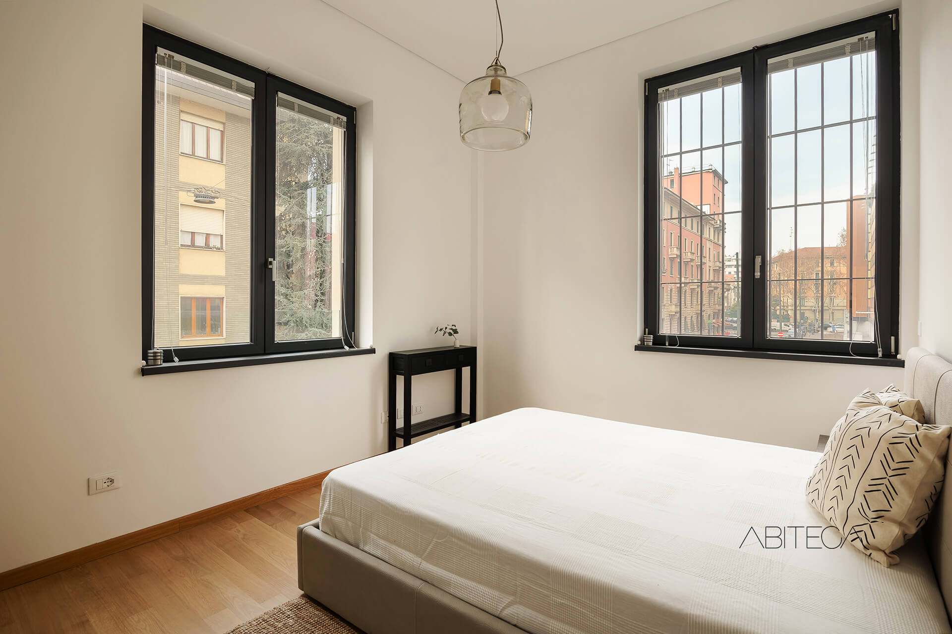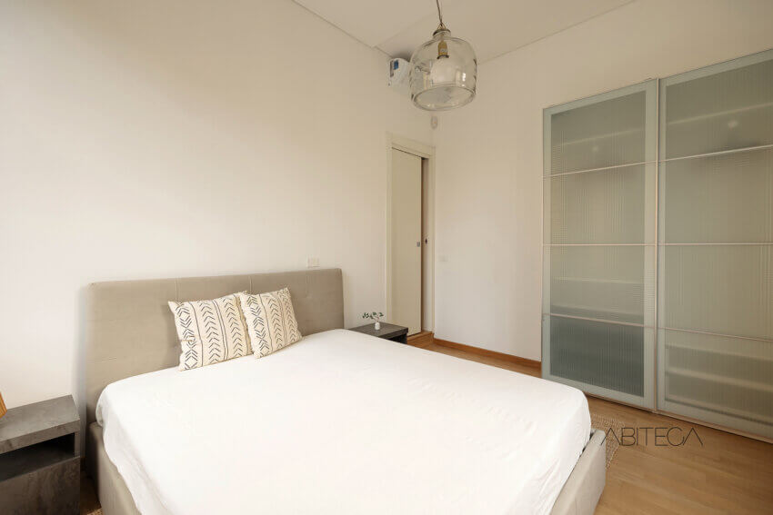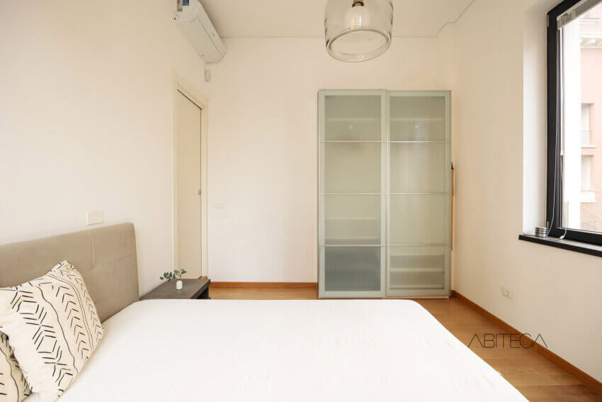Un disimpegno fornito di armadio separa la zona giorno dalla zona notte. La camera da letto è caratterizzata dalle due finestre ad angolo e dall’arredamento razionale e contenitivo: un armadio a due ante, un letto matrimoniale con vano sottostante e i comodini.