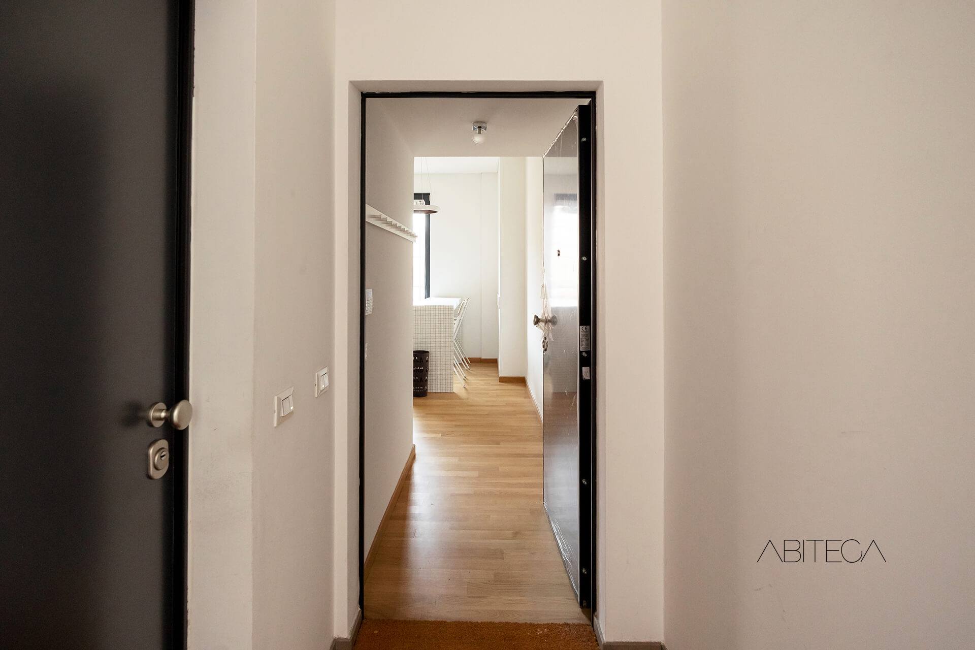 L’ingresso funge da filtro al resto della zona giorno. Sulla parete e per tutta la lunghezza troviamo un appendiabiti a muro.