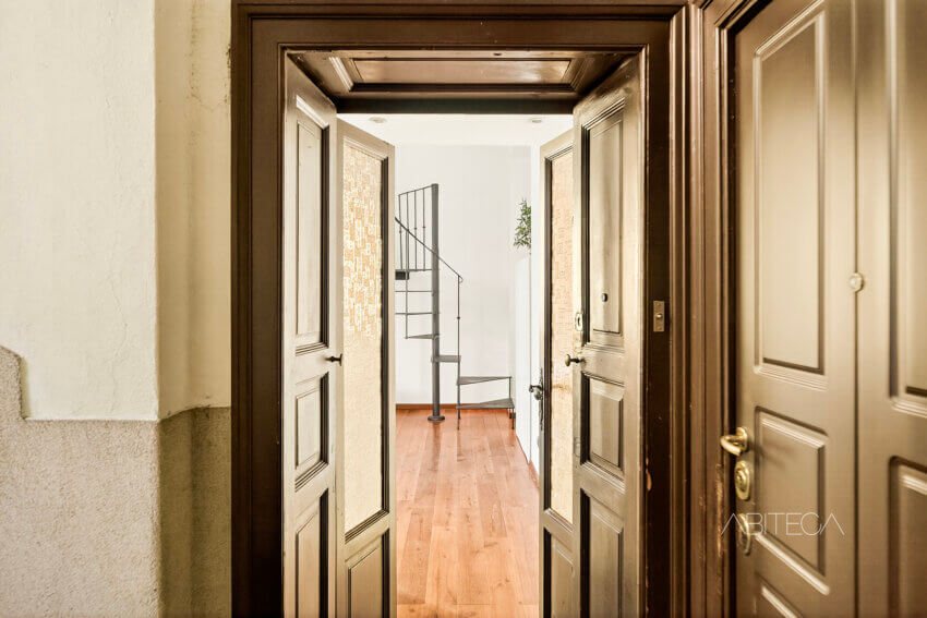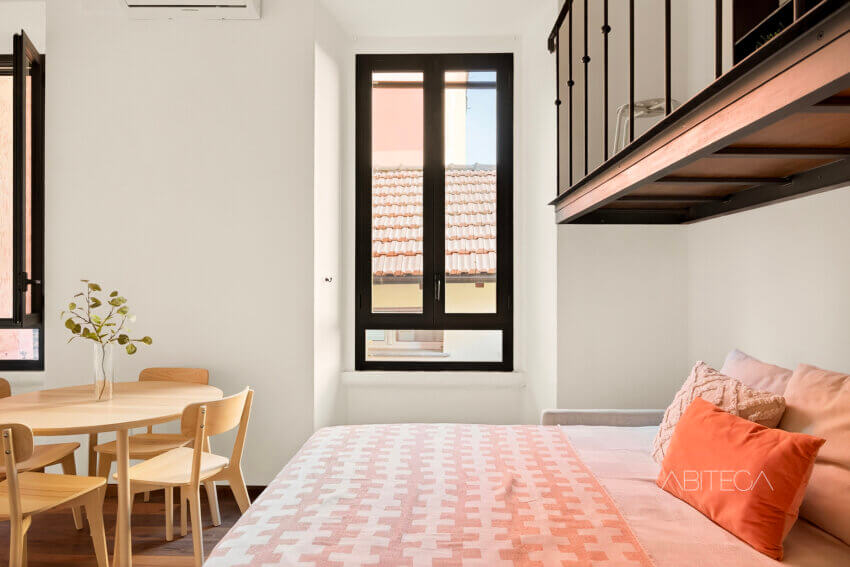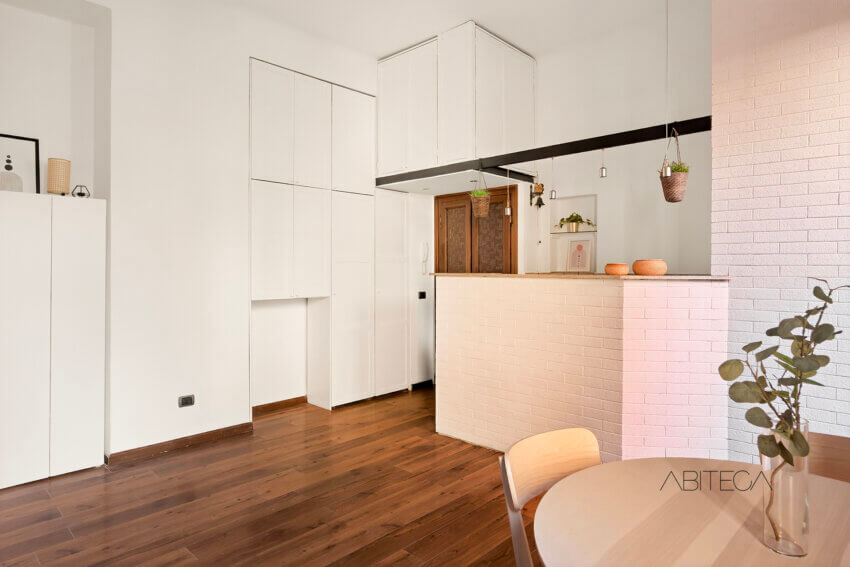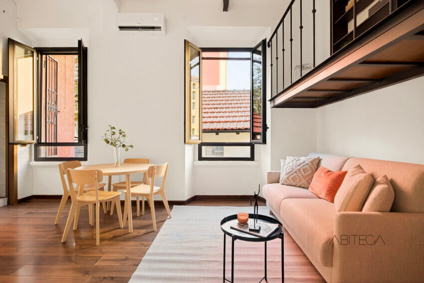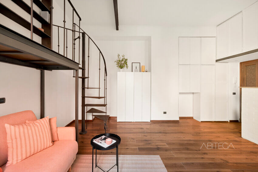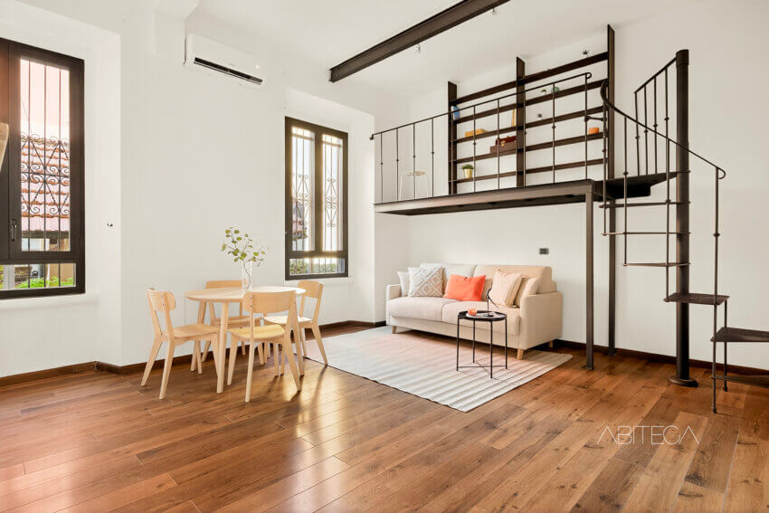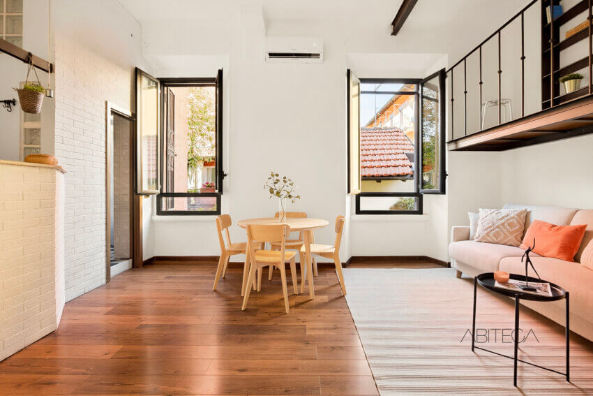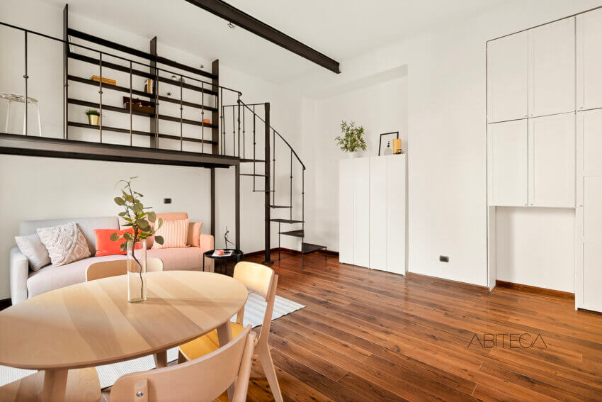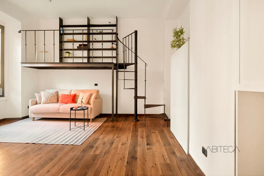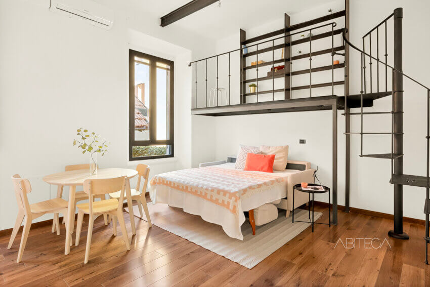Gli arredi sono nuovi e hanno un’organizzazione che facilita la vita quotidiana: oltre alla libreria sul soppalco, trovi gli armadi a muro in prossimità della scala e dell’ingresso, oltre a un ripostiglio in quota sopra la porta. Allo stesso tempo, la casa non appare riempita come se fosse un deposito.