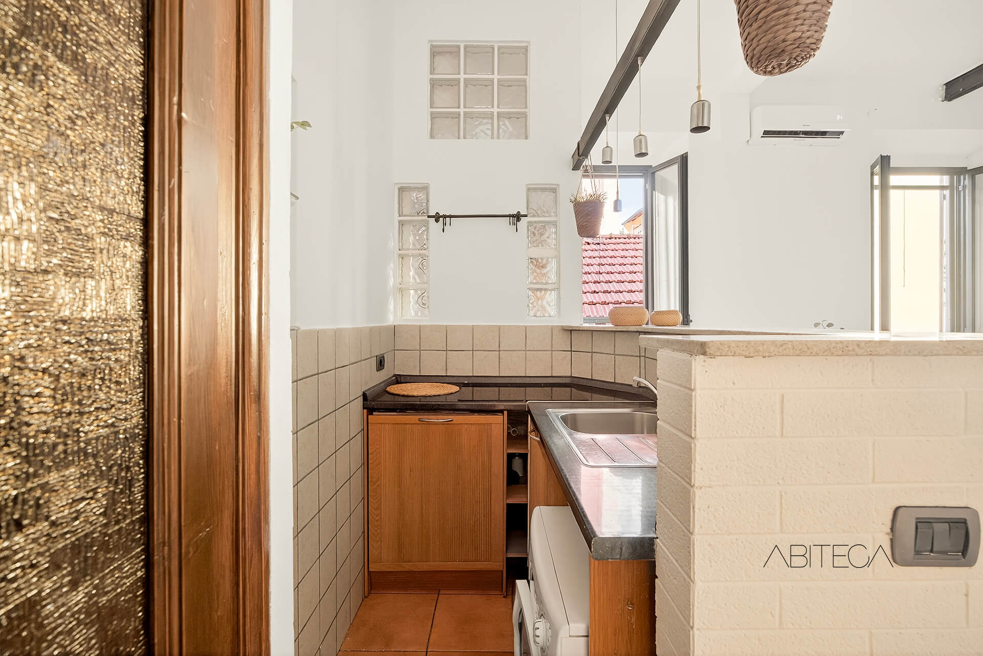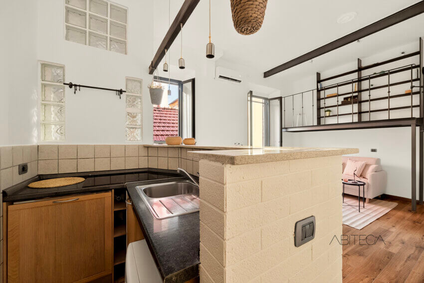 Il cucinino, schermato da un murettonasconde i fuochi e le attrezzature e permette di cucinare rivolti verso il living e le finestre. Qui trovi anche la lavatrice.