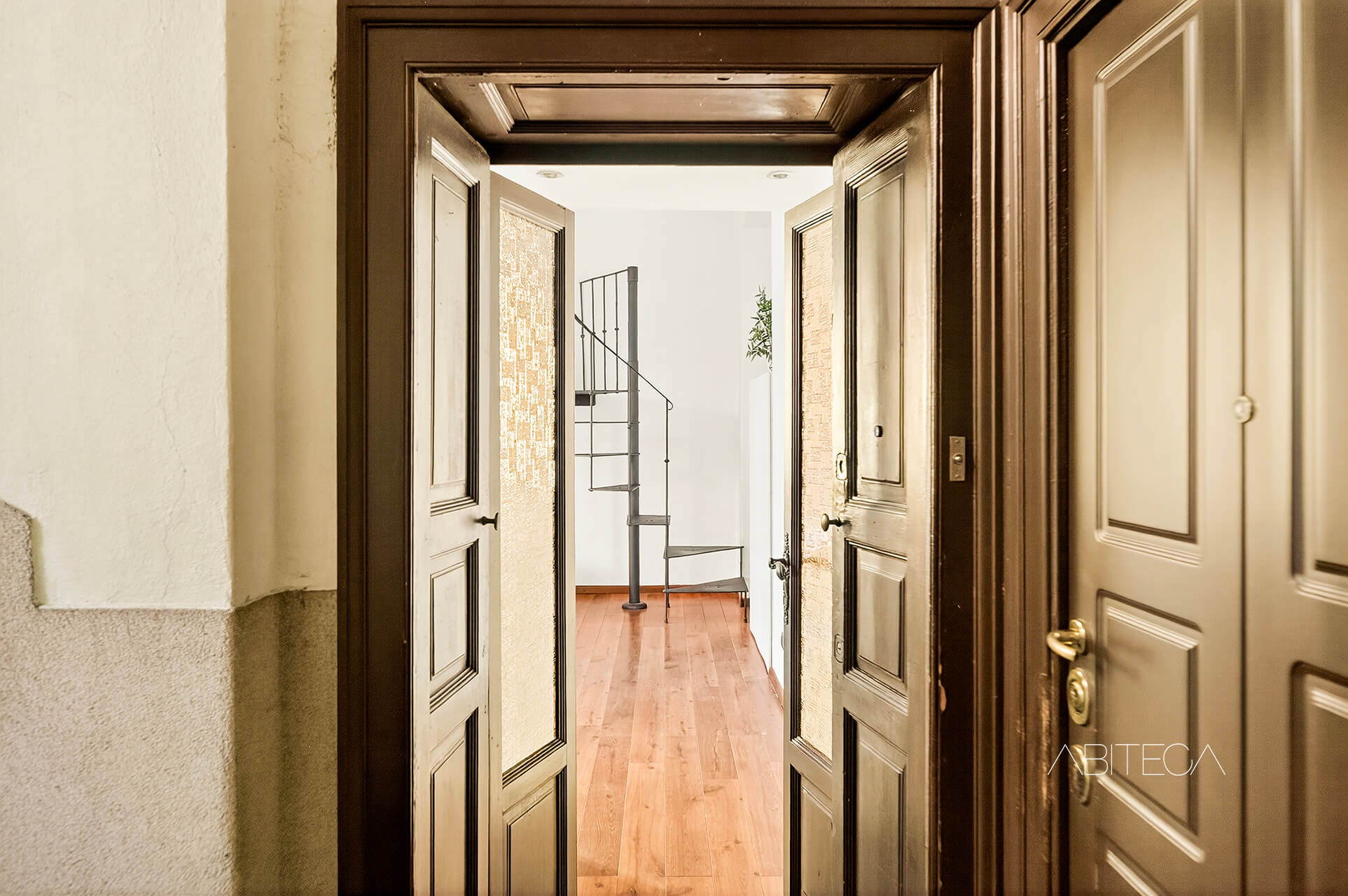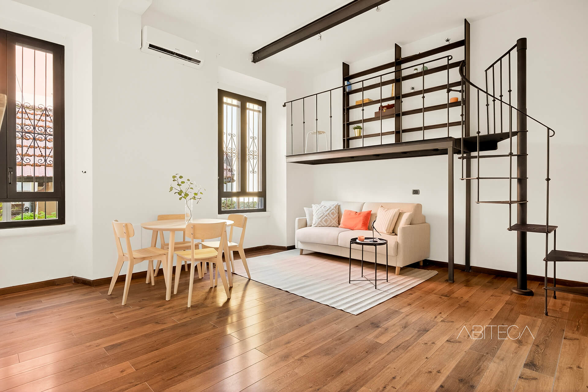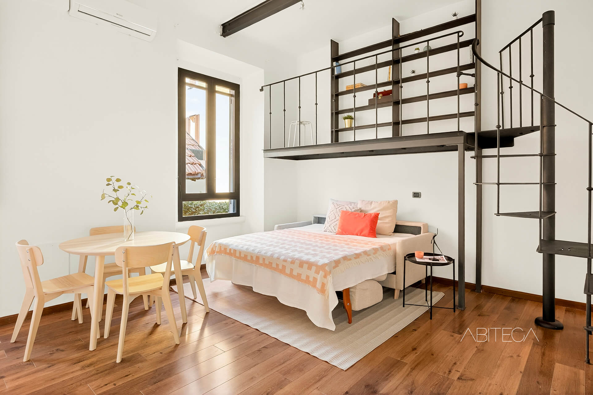 Un monolocale con soffitti alti, libreria a soppalco e una luce naturale che ti accoglie appena entri.