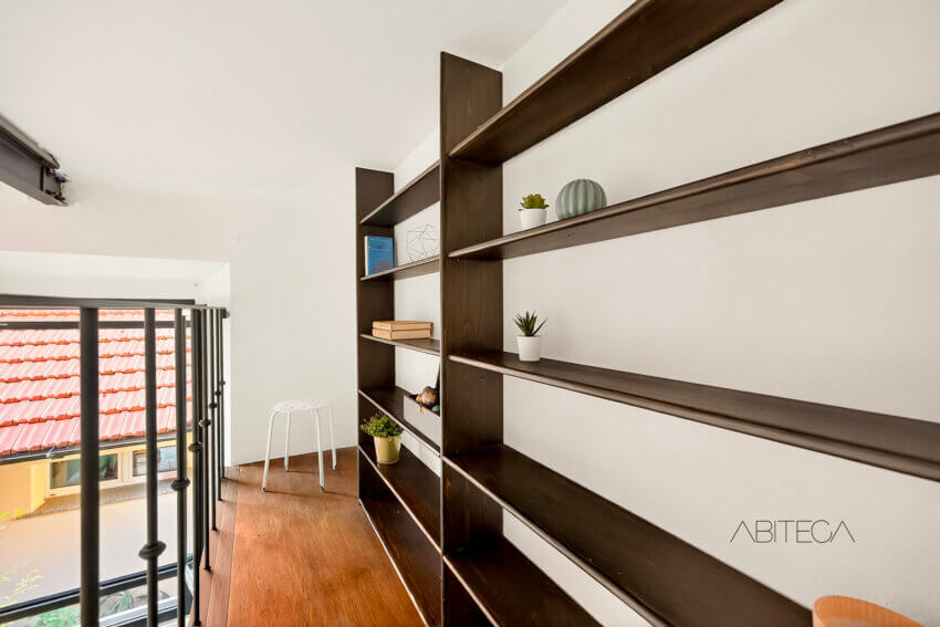 L’elemento distintivo che si nota appena entrati è il soppalco sviluppato lungo la parete di fondo: una struttura in ferro con libreria a tutta parete che dona carattere e offre un ordine intelligente.