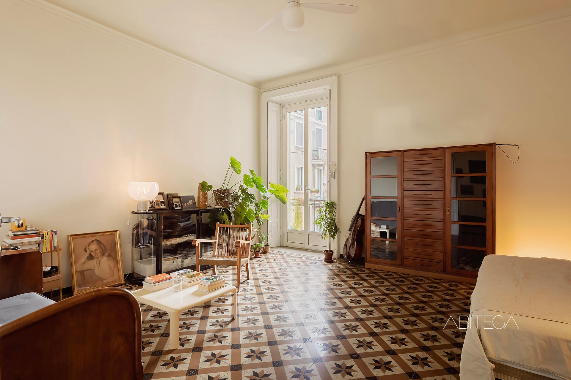 Il soggiorno misura oltre 23 mq e conserva le cementine d’epoca. C’è spazio per un’area conversazione con divano, poltrone e tavolino, e per una zona pranzo con tavolo. Dalle sedute del divano la prospettiva si allunga verso la porta finestra con il balcone affacciato sul cortile interno.