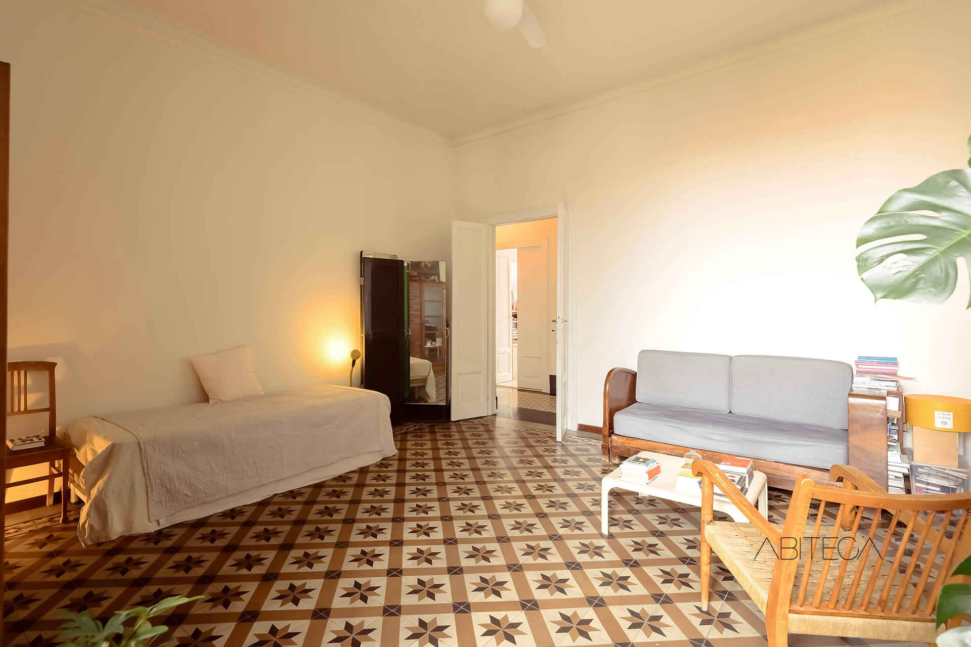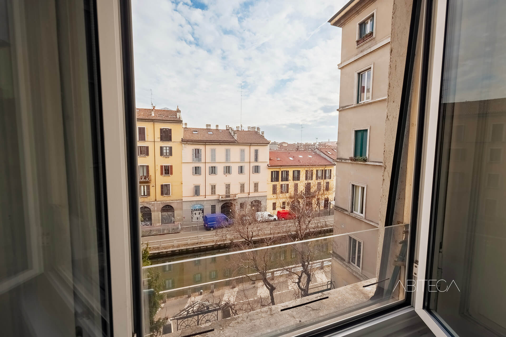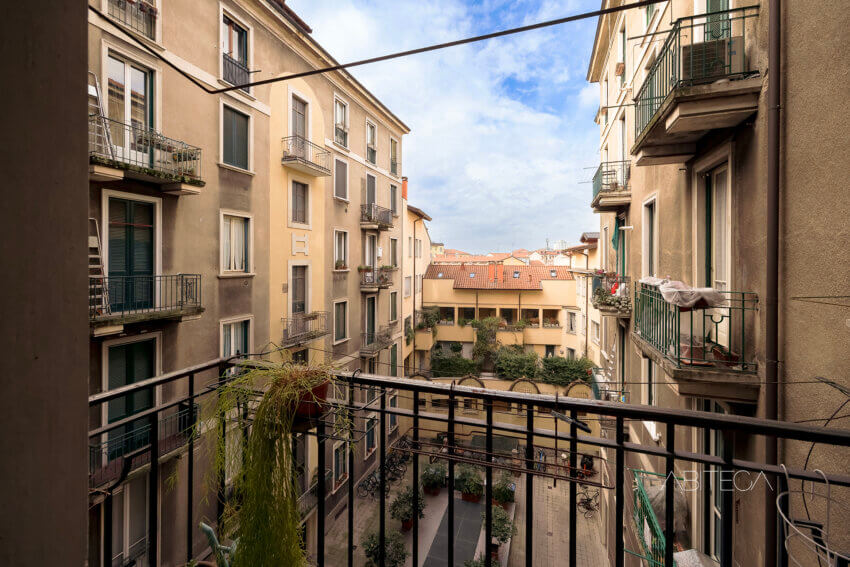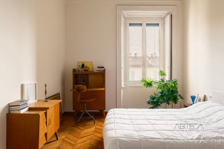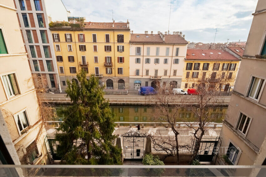 Per l’atmosfera. Siamo in un palazzo milanese degli anni ’30 che si distingue nel quartiere Navigli per lo stile geometrico ispirato all’Art Déco. L’appartamento si trova al terzo piano, ha soffitti alti tipici delle case d’epoca, e una pianta signorile con l’ampio corridoio che accompagna in tutte le stanze. La posizione è particolare: dall’appartamento si gode della vista sul Naviglio Pavese pur trovandoci in una posizione arretrata rispetto alla strada (l’affaccio è sul giardino condominiale). La casa è in buone condizioni e pronta da abitare, con un bagno recentemente ristrutturato.