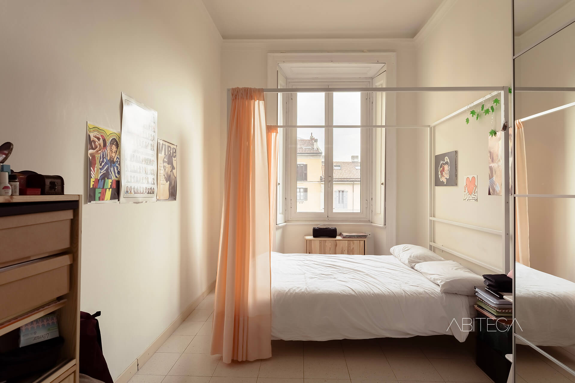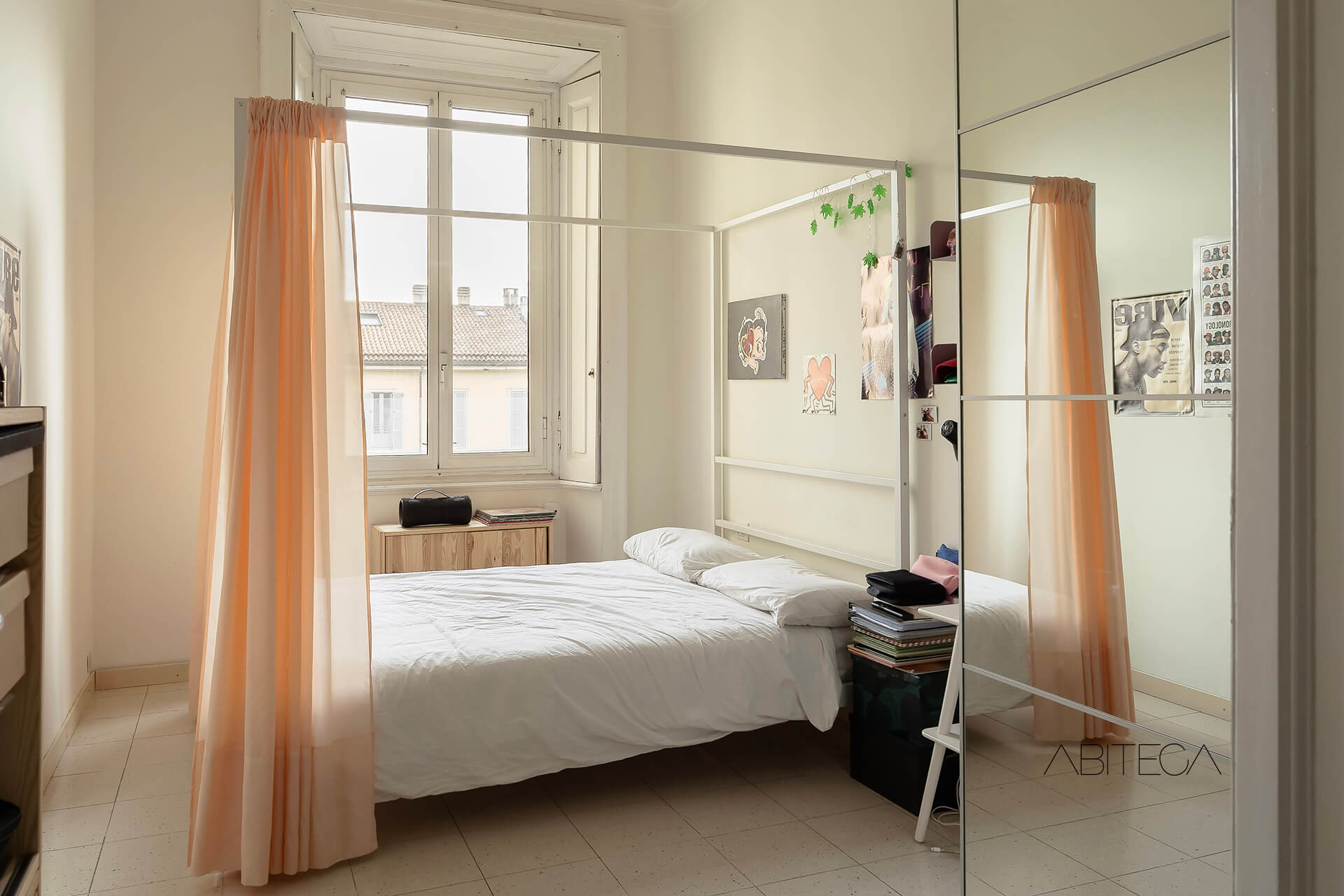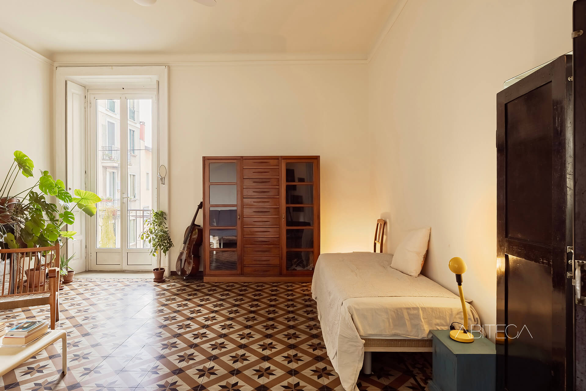 Per l’atmosfera. Siamo in un palazzo milanese degli anni ’30 che si distingue nel quartiere Navigli per lo stile geometrico ispirato all’Art Déco. L’appartamento si trova al terzo piano, ha soffitti alti tipici delle case d’epoca, e una pianta signorile con l’ampio corridoio che accompagna in tutte le stanze. La posizione è particolare: dall’appartamento si gode della vista sul Naviglio Pavese pur trovandoci in una posizione arretrata rispetto alla strada (l’affaccio è sul giardino condominiale). La casa è in buone condizioni e pronta da abitare, con un bagno recentemente ristrutturato.