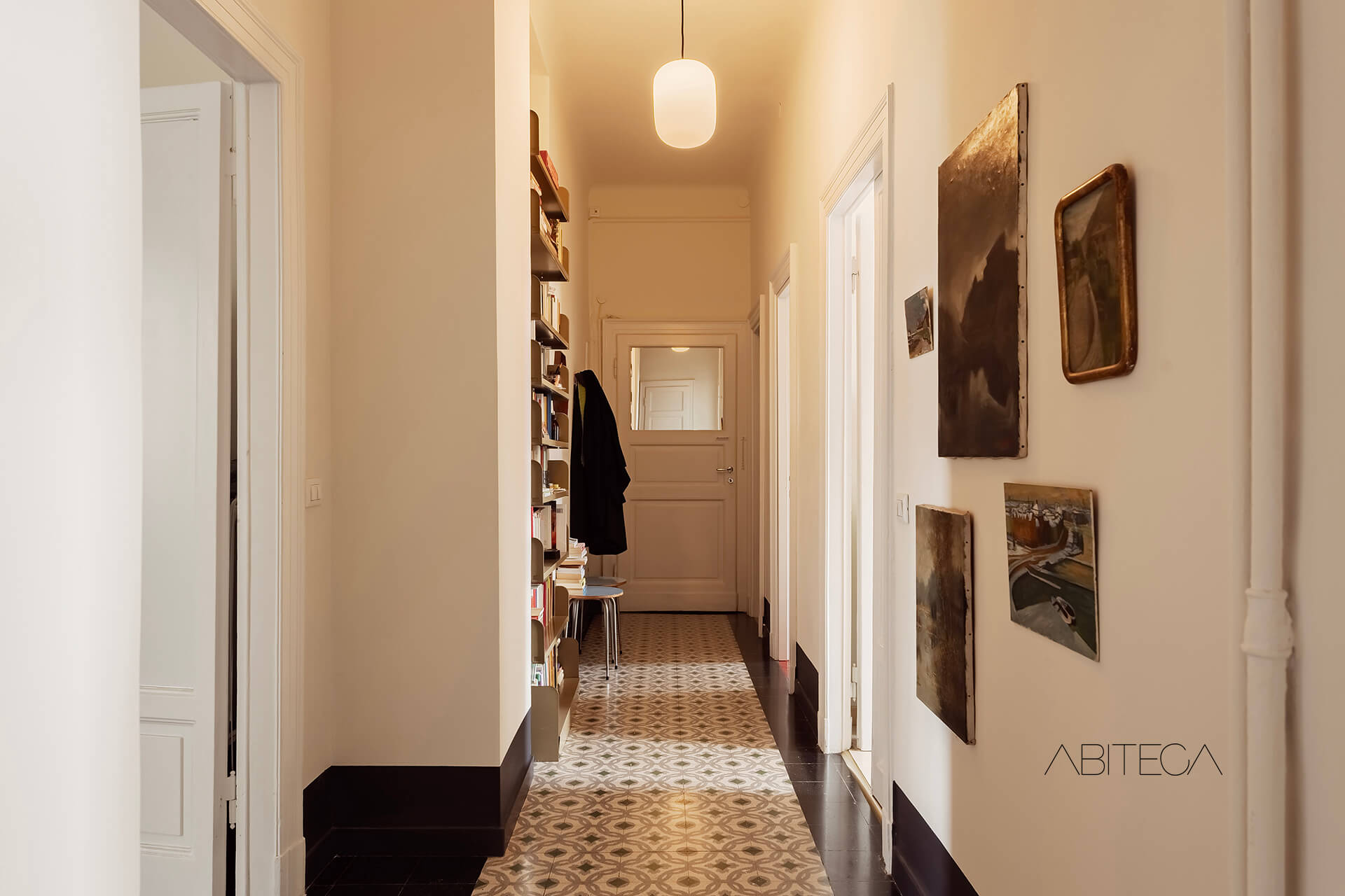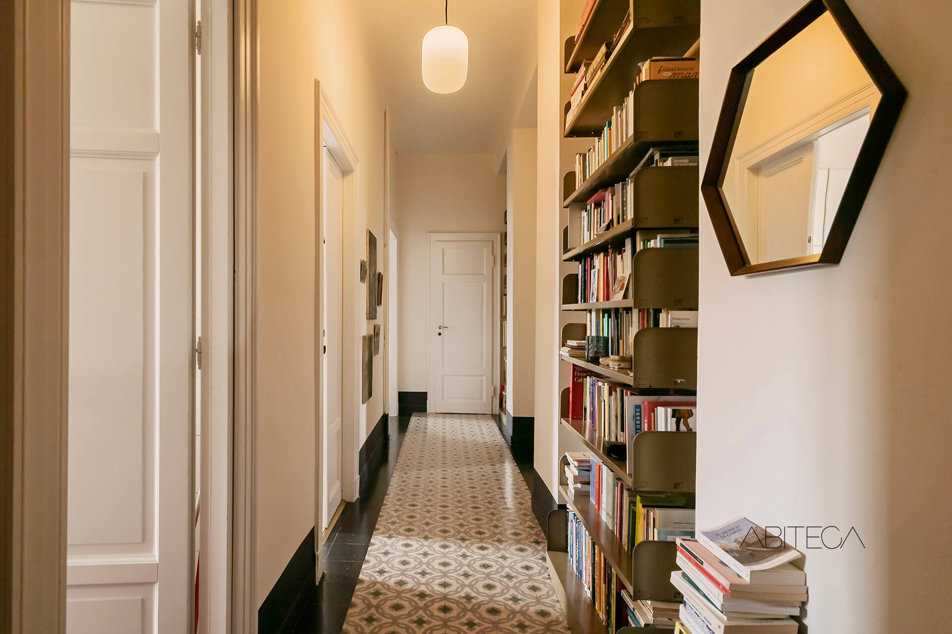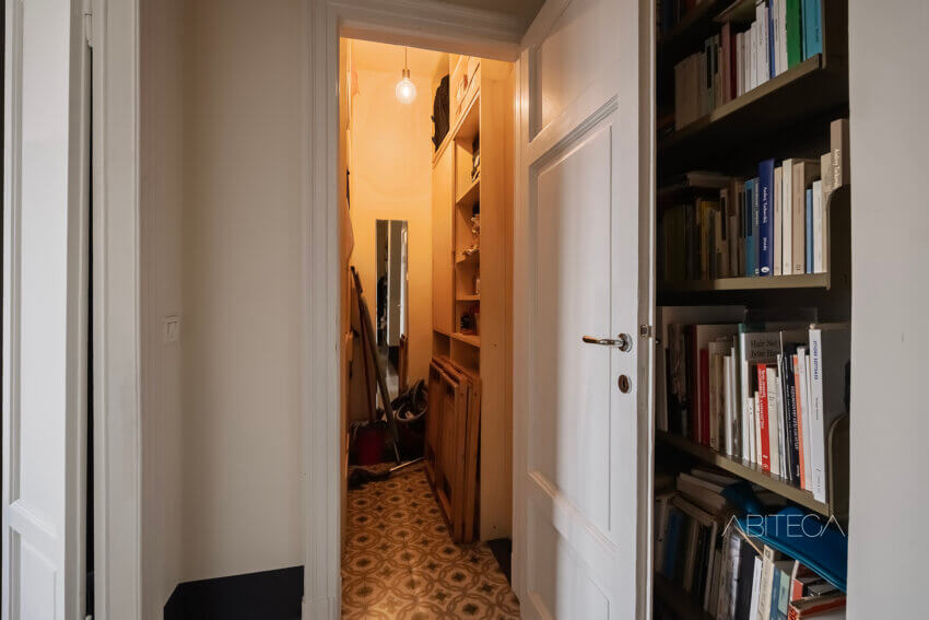 Il corridoio è caratterizzato dal pavimento originale con motivi geometrici. Percorrendolo, troviamo due librerie che arredano e rendono questo spazio suggestivo da attraversare. In fondo c’è anche una stanza ripostiglio, completamente attrezzata con mobilio e scaffali.