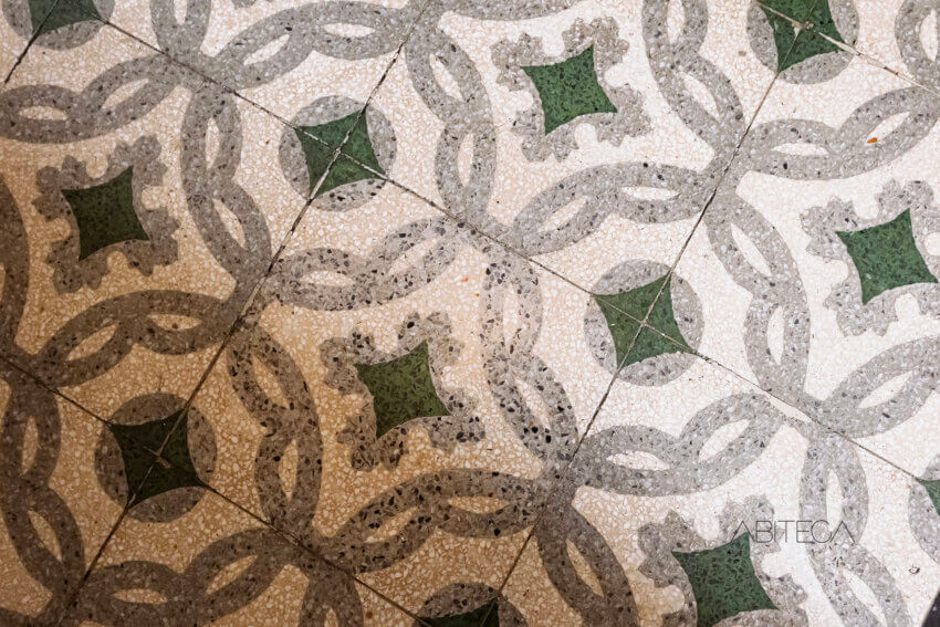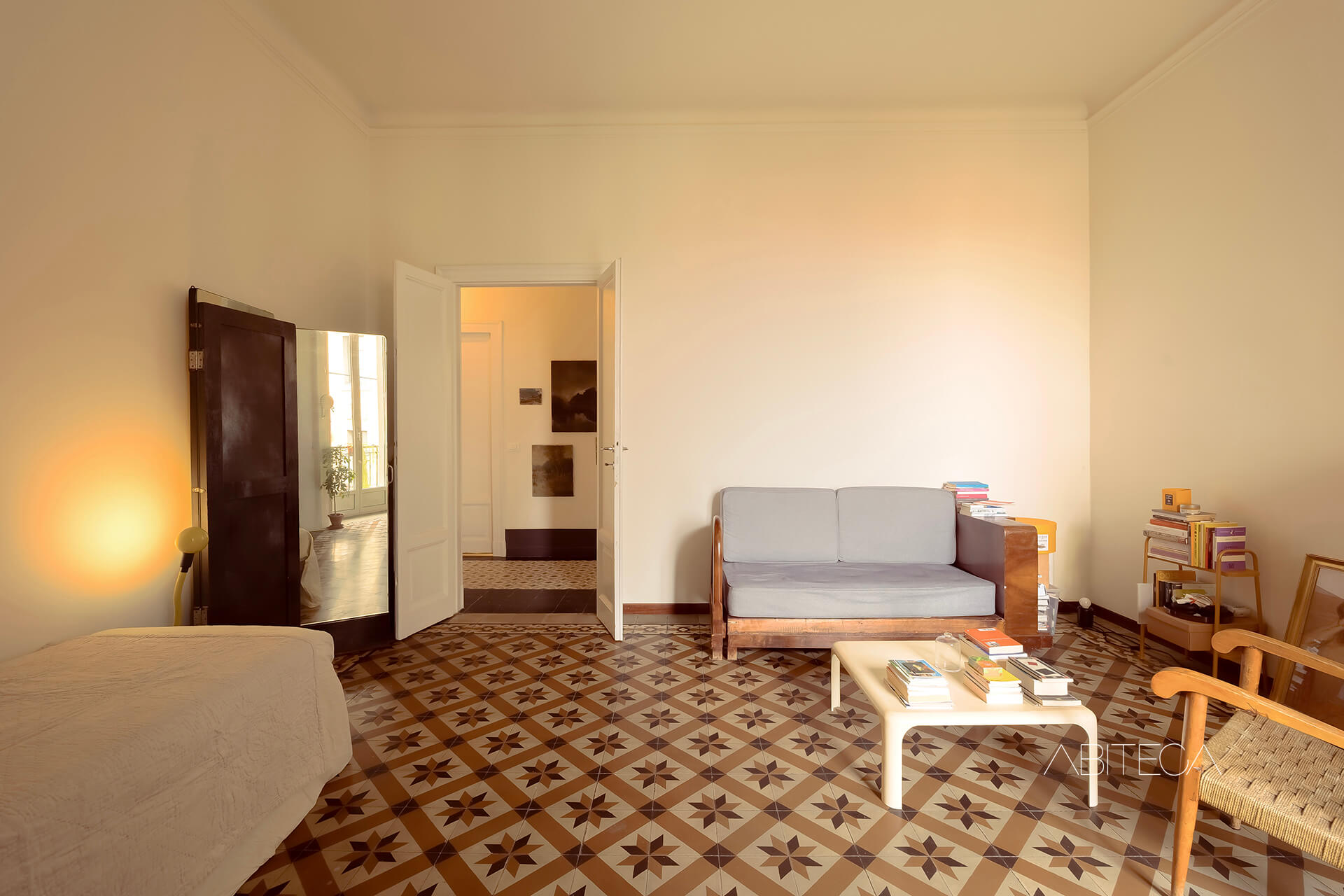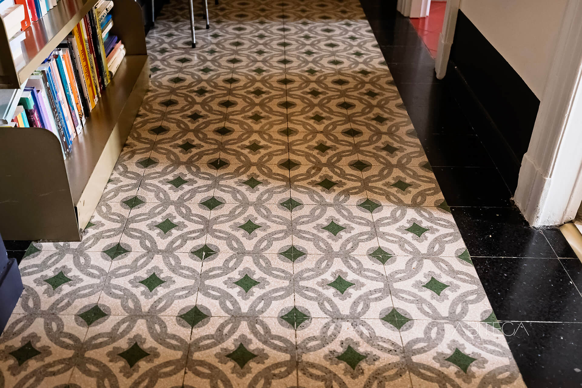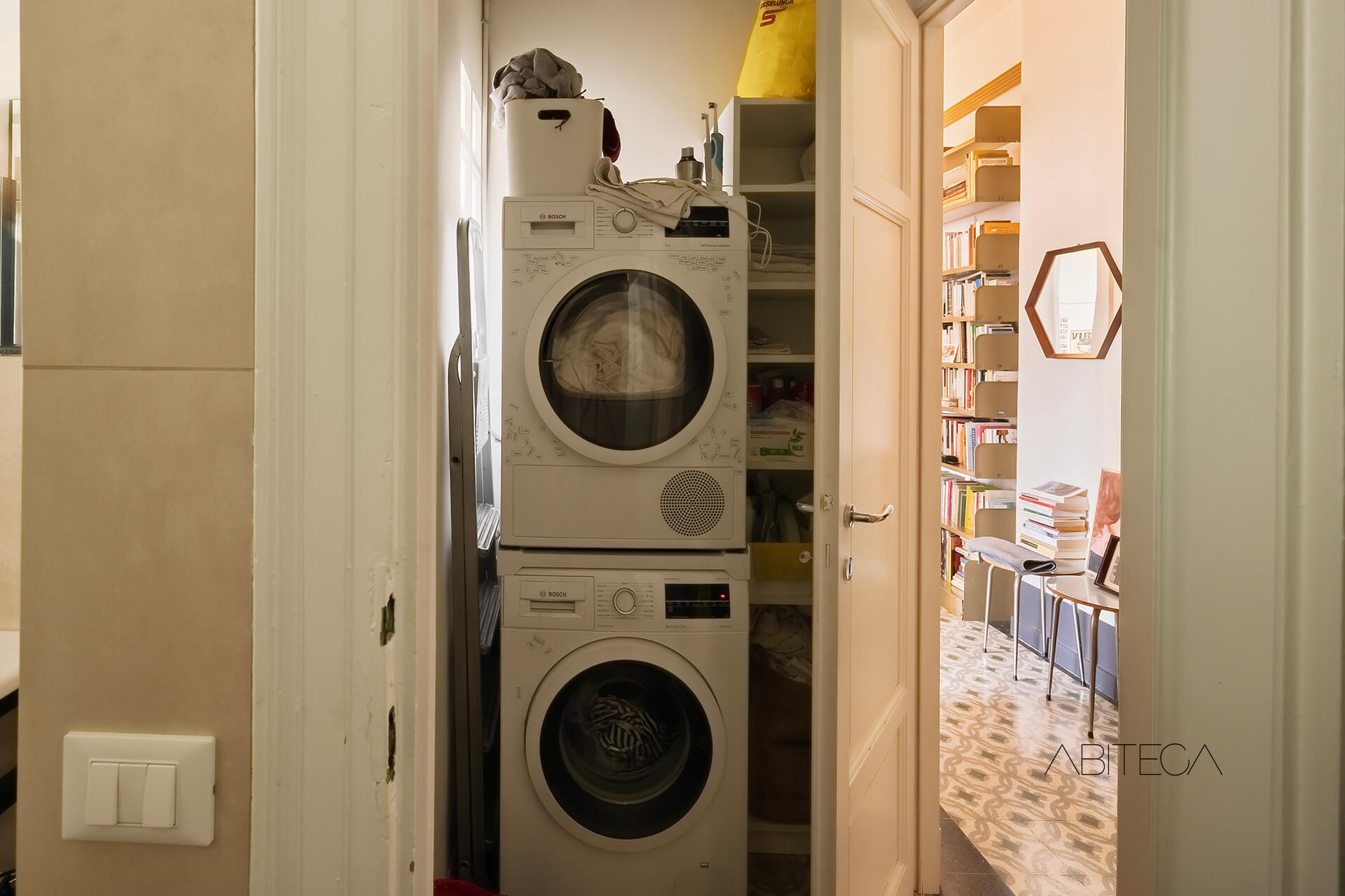 Il corridoio è caratterizzato dal pavimento originale con motivi geometrici. Percorrendolo, troviamo due librerie che arredano e rendono questo spazio suggestivo da attraversare. In fondo c’è anche una stanza ripostiglio, completamente attrezzata con mobilio e scaffali.