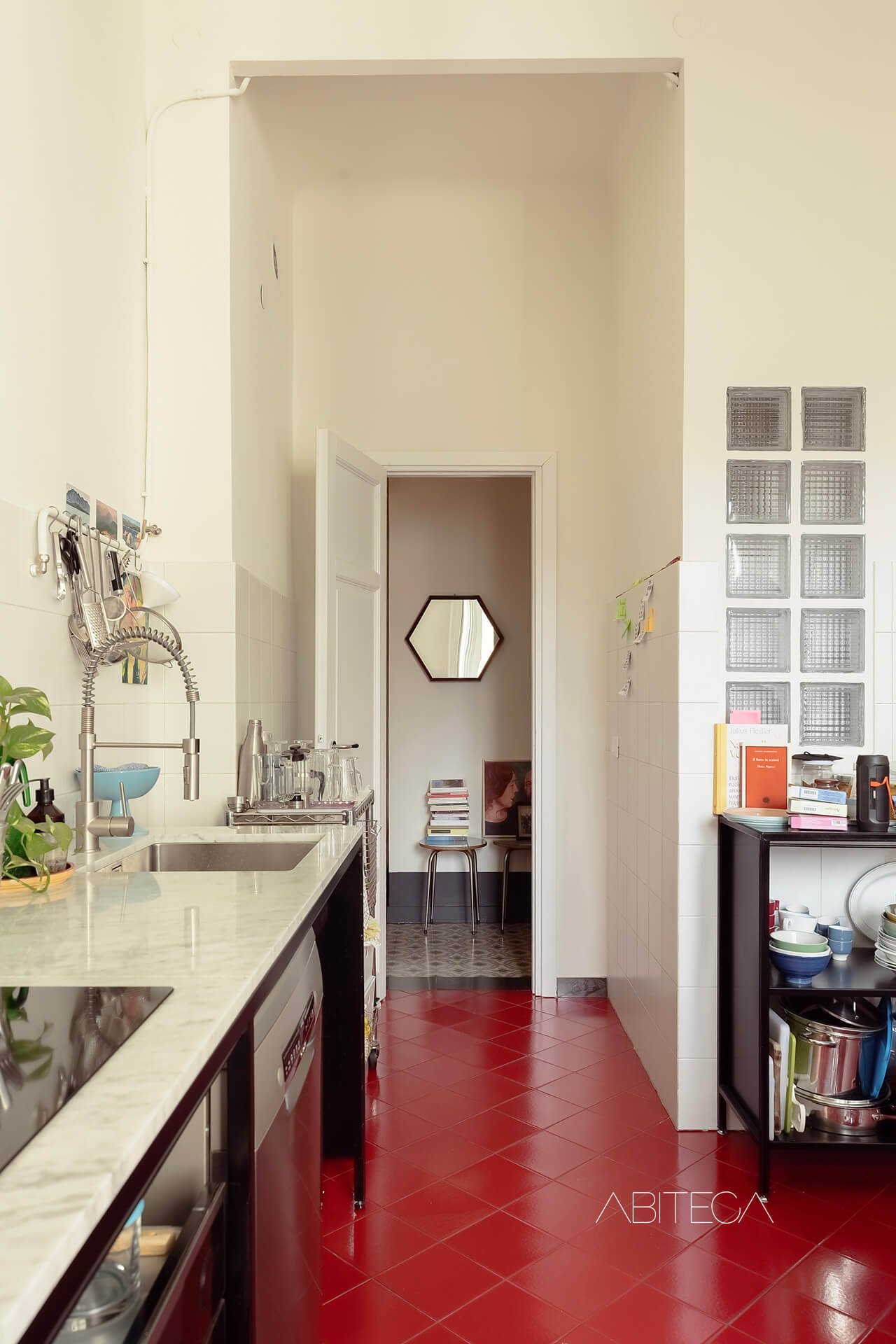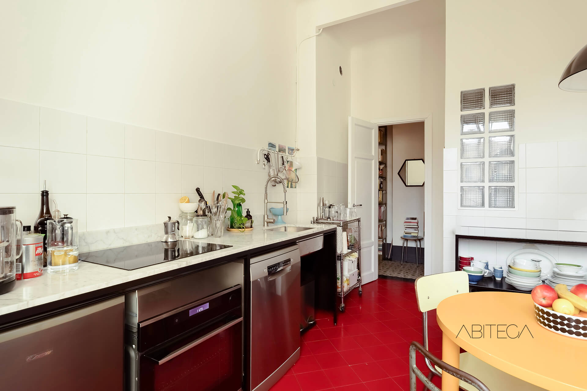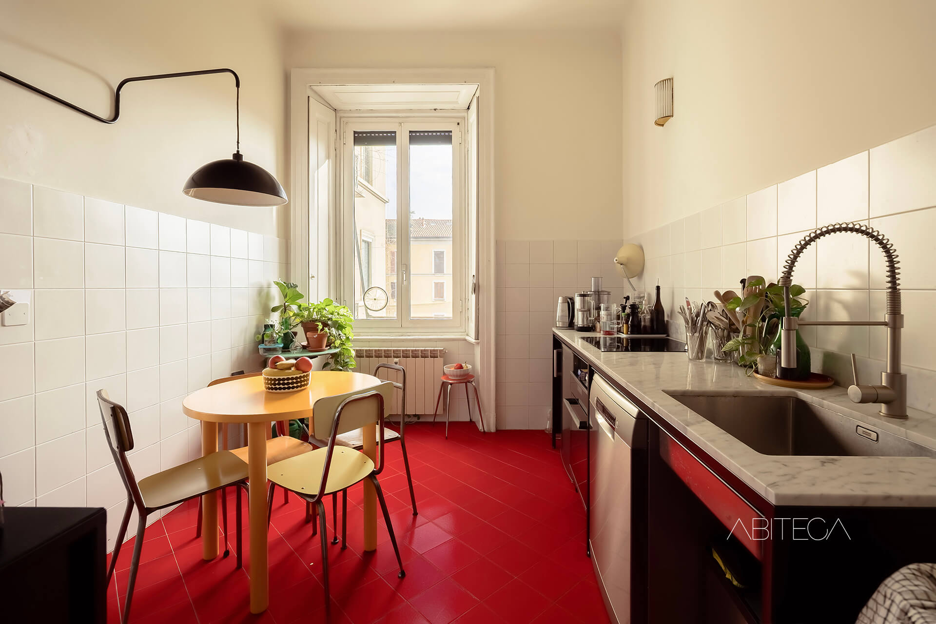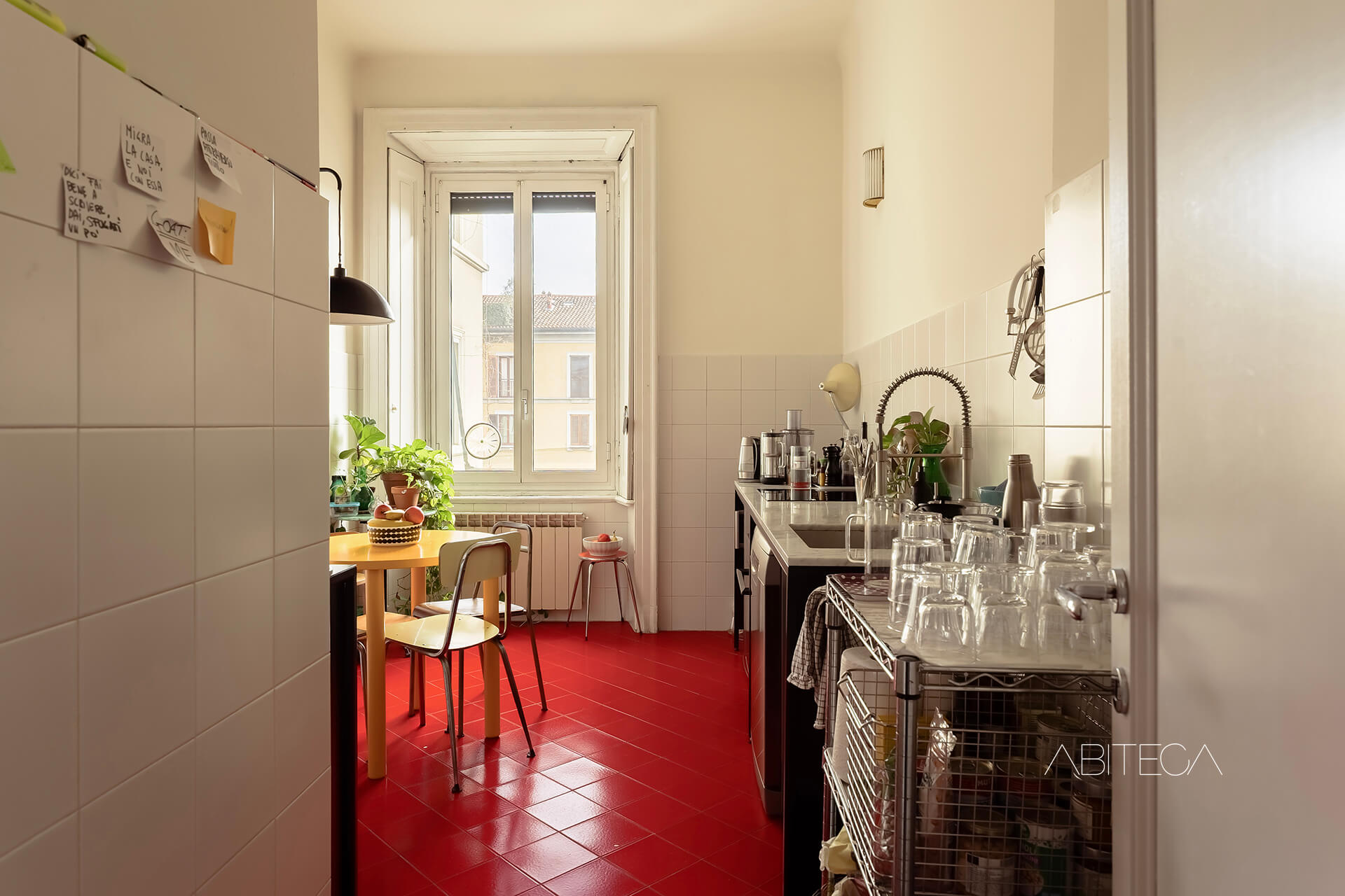 La cucina è abitabile: c’è lo spazio per il tavolo da pranzo e la parete cucina completa. La finestra garantisce luce e aerazione. Le piastrelle rosse a terra conferiscono carattere alla stanza e possono essere lette come elemento vintage distintivo, più adatto all’ambiente domestico di una cucina.