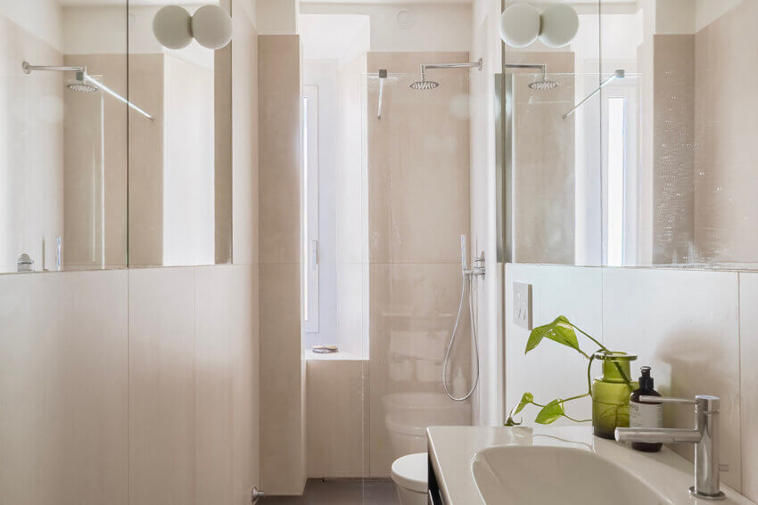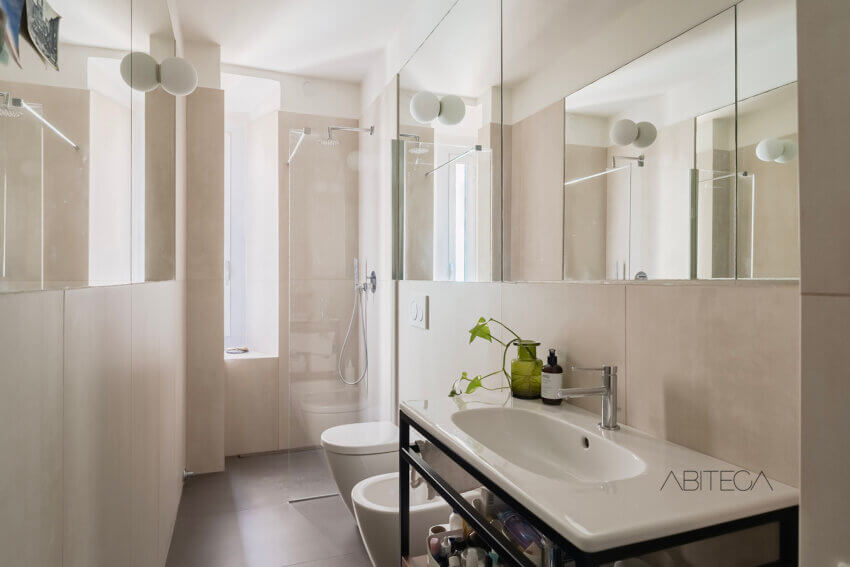 Prima del bagno c’è un antibagno dove trovano posto lavatrice e asciugatrice: una soluzione che libera lo spazio principale da ingombri visivi. Il bagno è finestrato, recentemente rinnovato con toni neutri e uno stile pulito. Presenta una comoda doccia walk-in vicino alla finestra. Le finiture sono moderne, l’insieme è ordinato ed esteticamente piacevole.