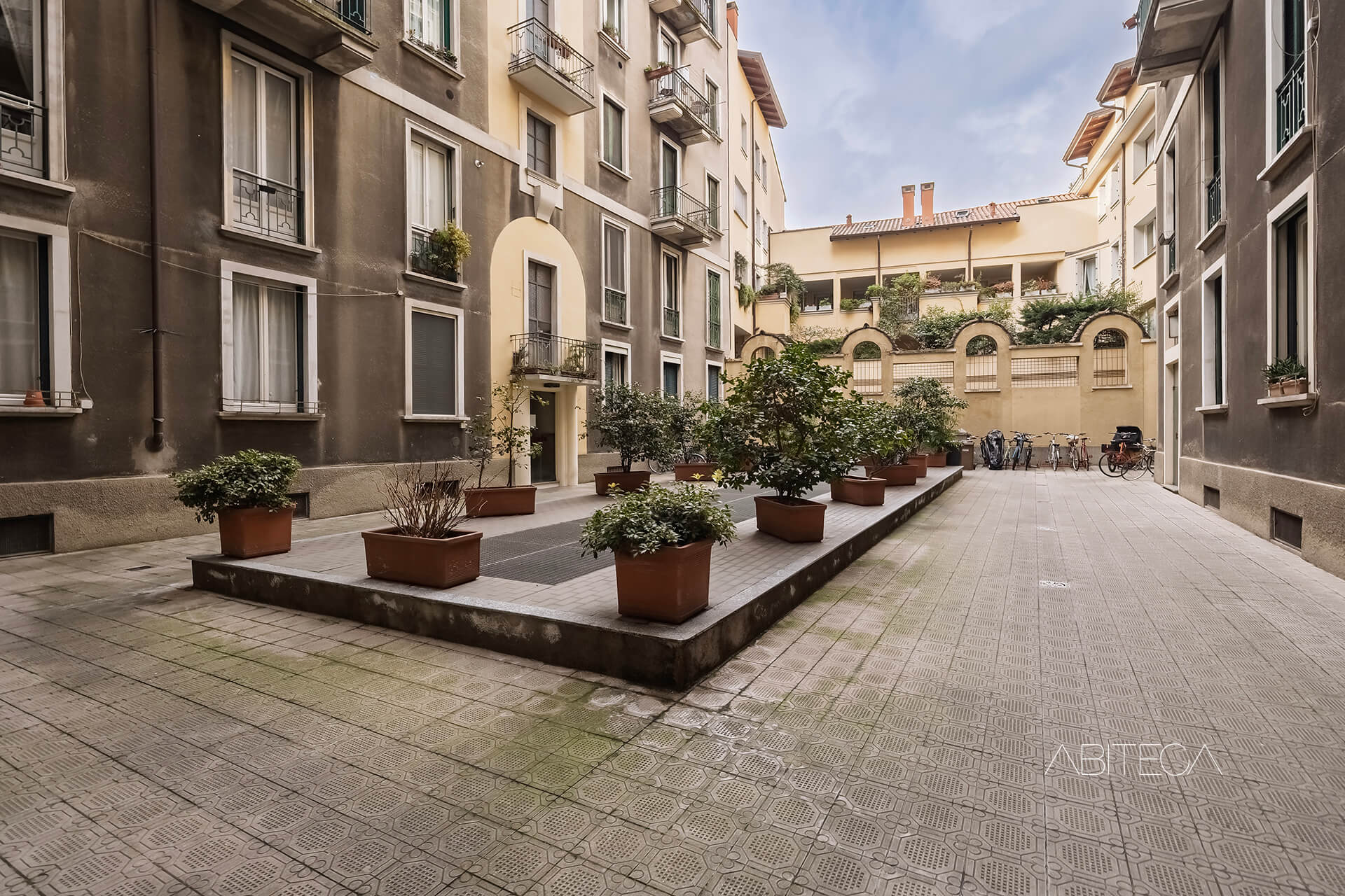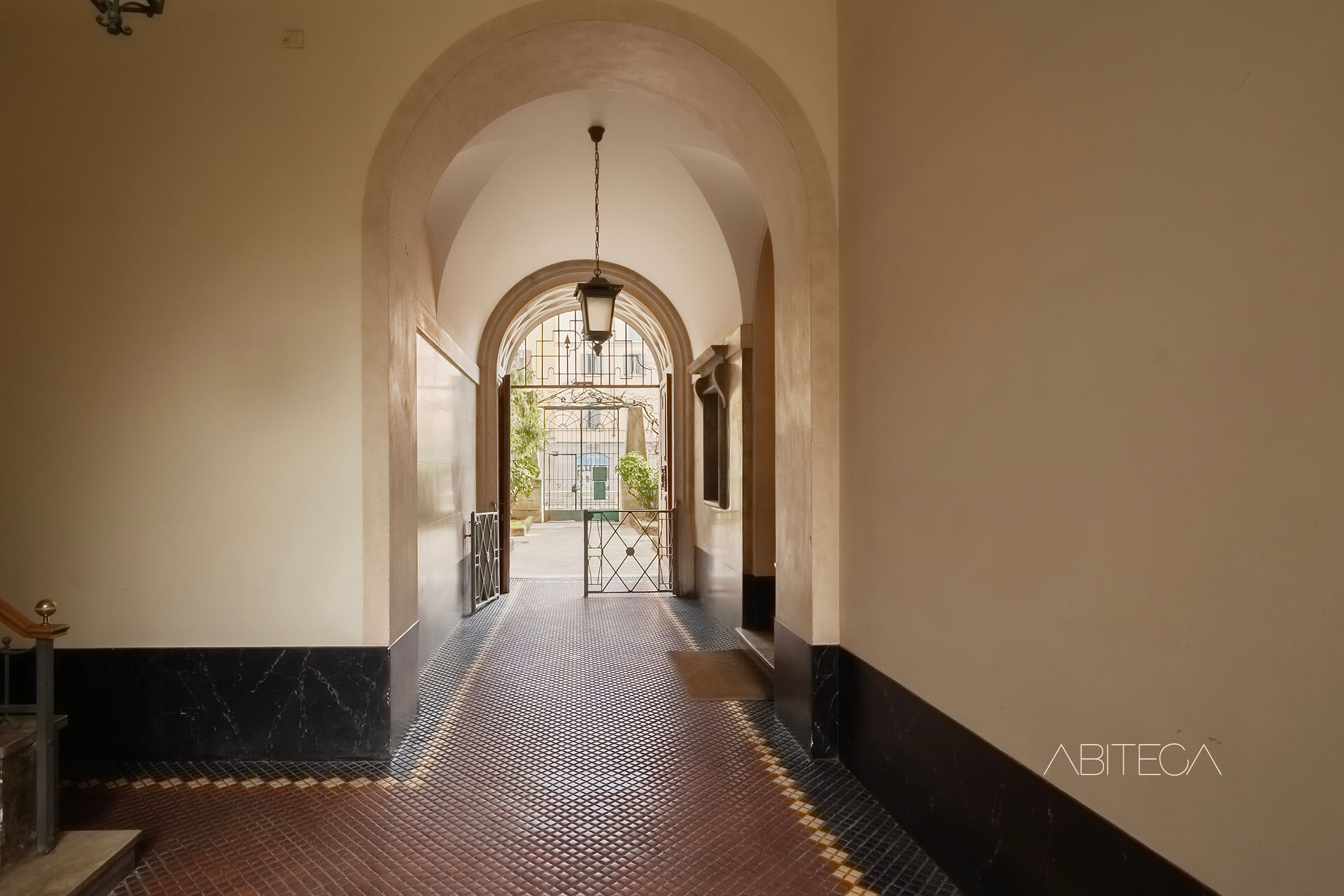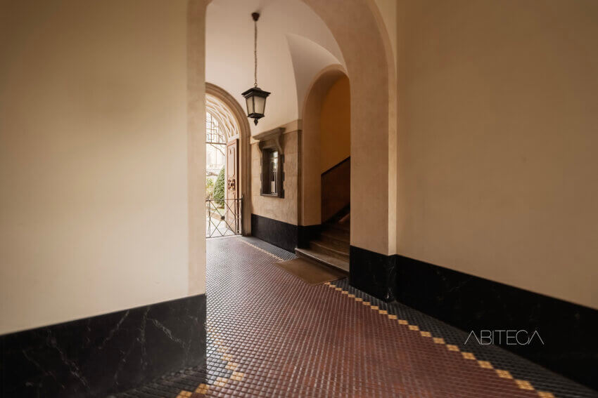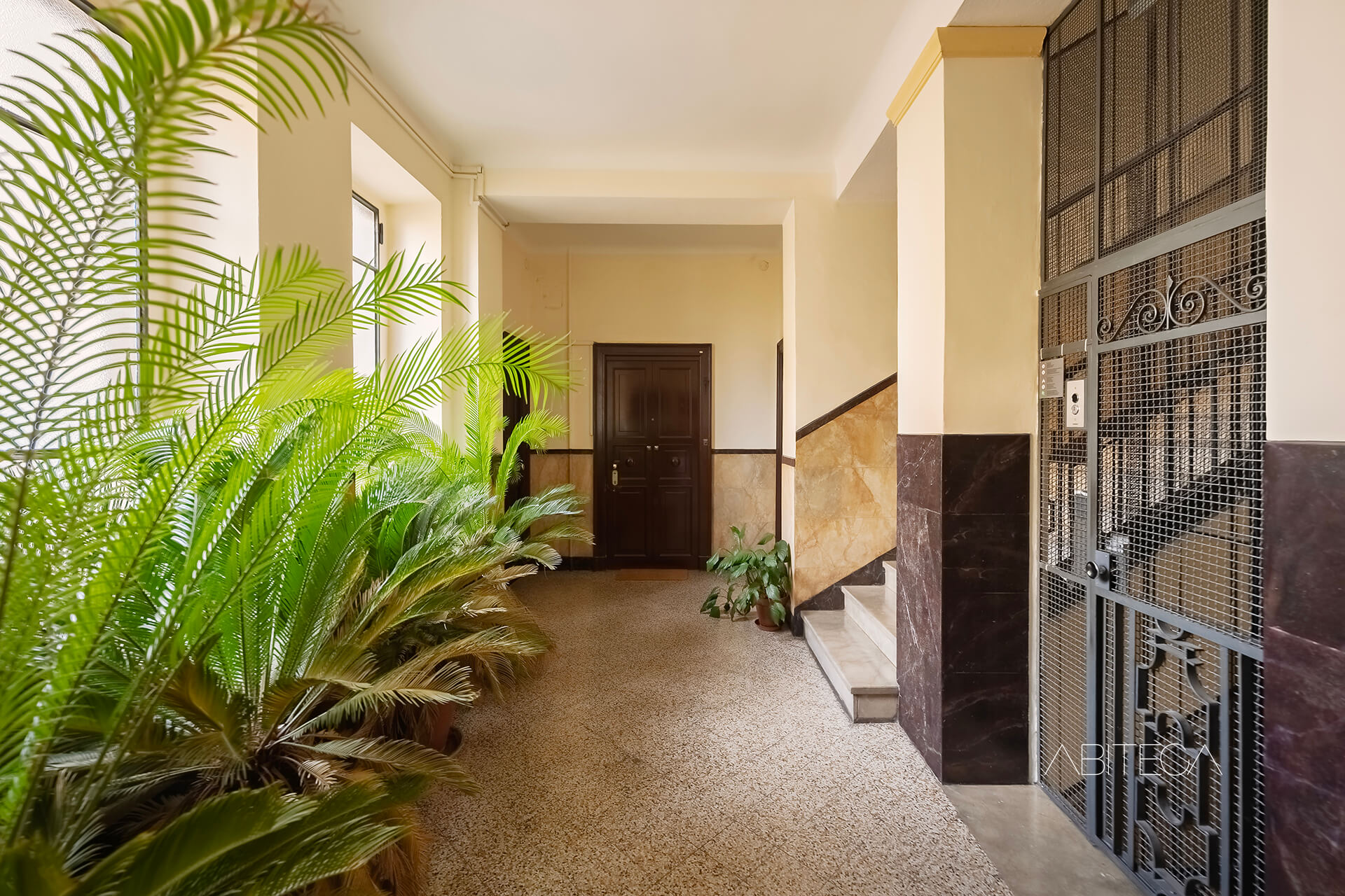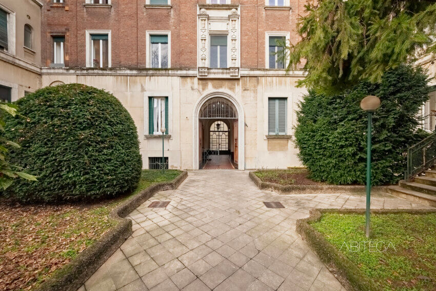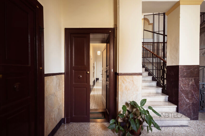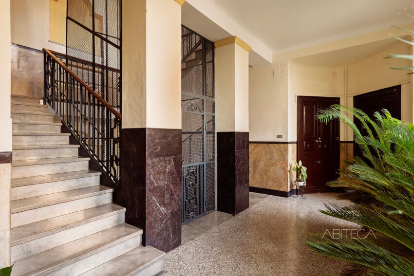 L’androne ha le volte a crociera, i pavimenti originali, le zoccolature in marmo. Il vano ascensore è quello storico in ferro battuto. Il pianerottolo è ampio e luminoso, con piante rigogliose che danno il benvenuto. L’impressione è di un contesto dove le parti comuni sono state pensate con cura, non solo come passaggi ma come spazi gradevoli e di rappresentanza.