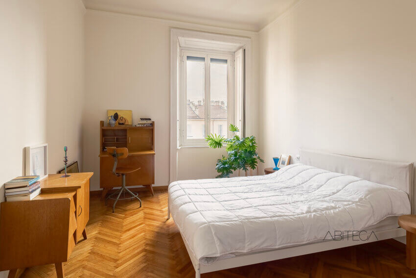 Le due camere hanno dimensioni importanti: entrambe possono ospitare un letto matrimoniale con tutti gli arredi complementari. La prima camera presenta un parquet a spina di pesce che scalda l’ambiente. La seconda è leggermente più allungata nella forma, con pavimentazione più neutra ma stessa generosità di metratura.