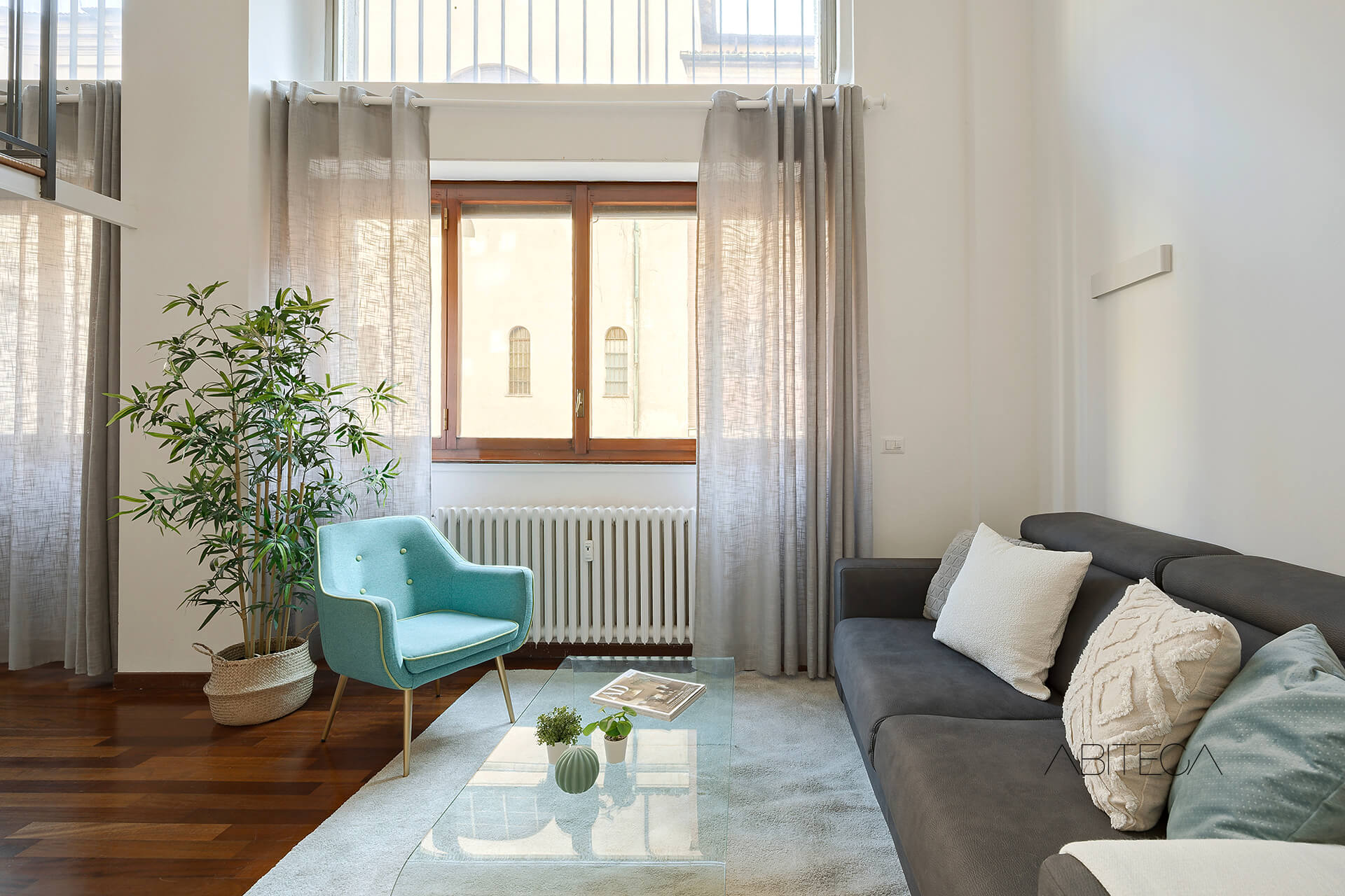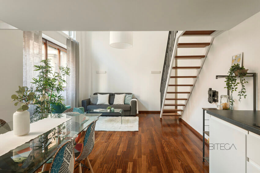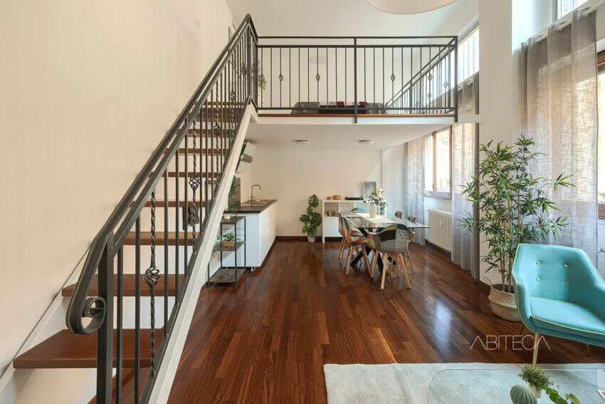 3) Il parquet (presente in soggiorno, camera, disimpegno, soppalco e persino sui gradini della scala) uniforma e scalda gli ambienti. Il risultato è un’atmosfera calda e tranquilla, con l’esposizione a sud e la verticalità degli ambienti che garantiscono una bella luce interna, anche nei mesi invernali.
