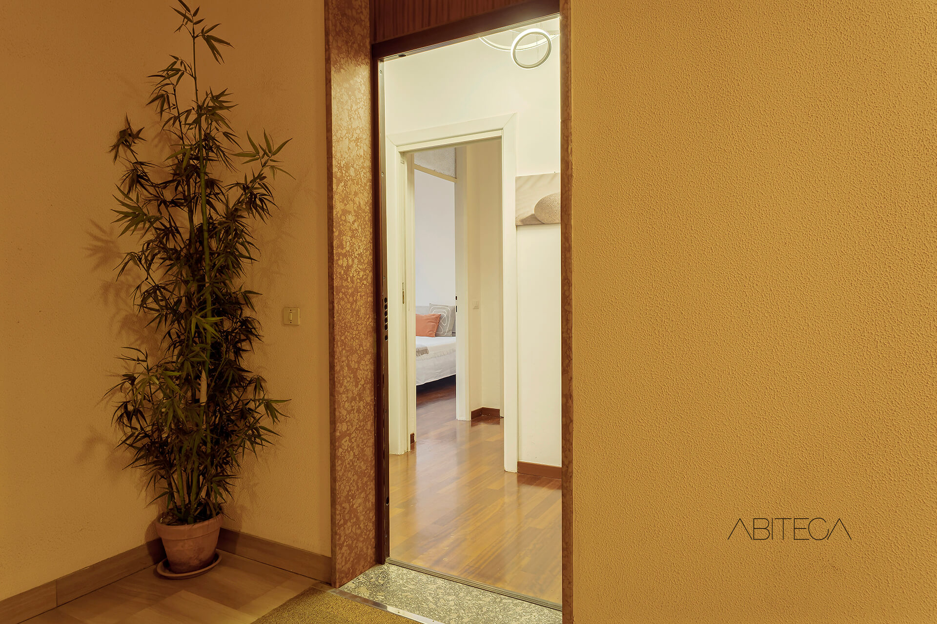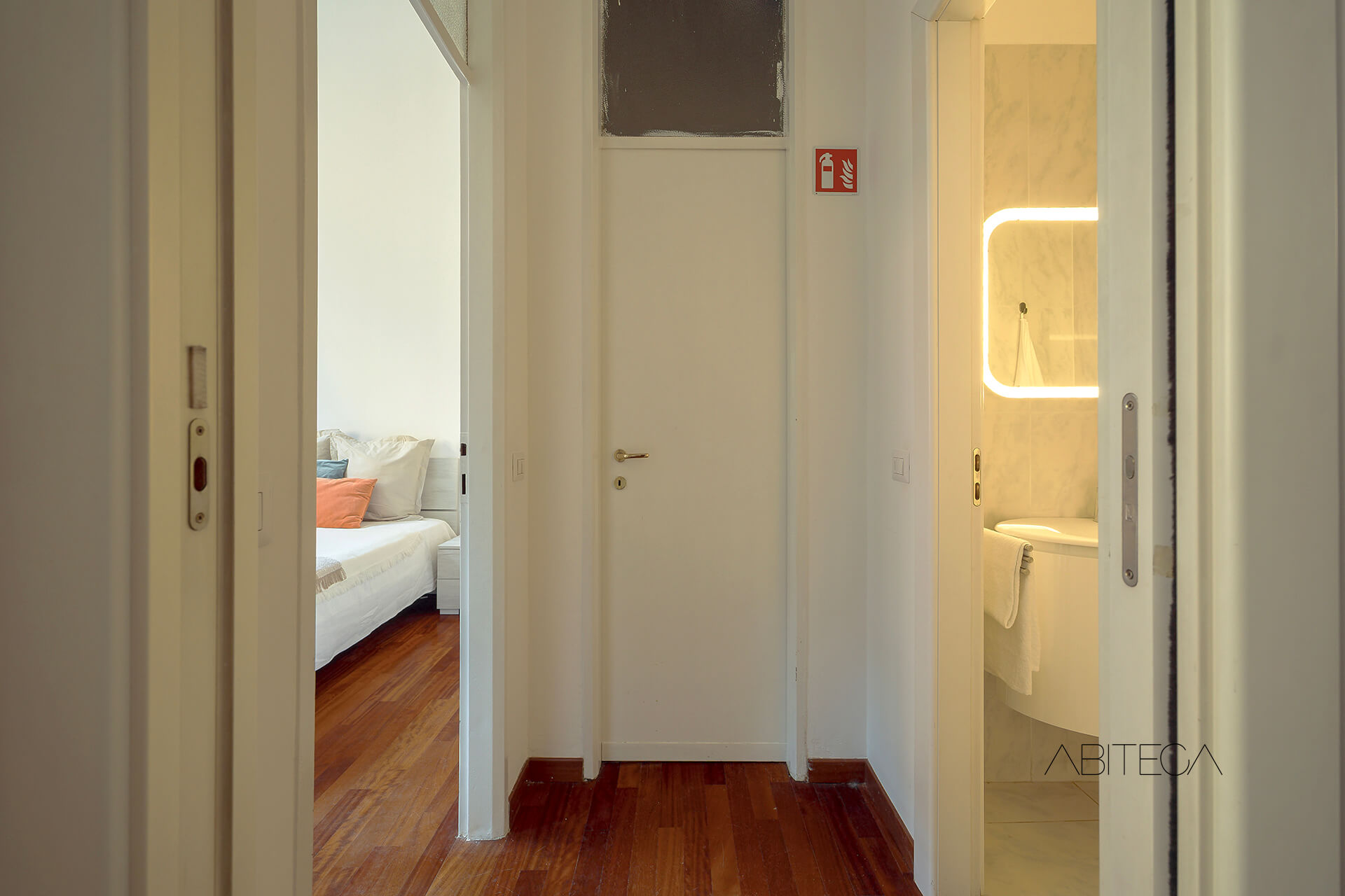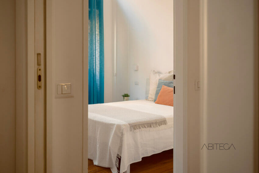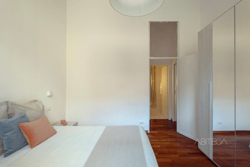Proseguendo, si arriva a un disimpegno che separa l’open space dagli altri ambienti. Qui 3 porte conducono alla camera matrimoniale, al ripostiglio/lavanderia e al bagno.