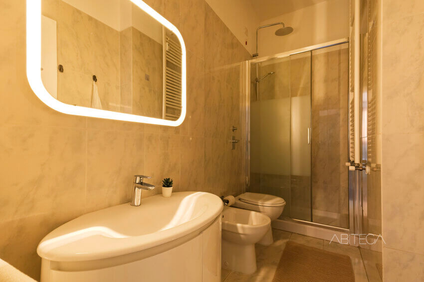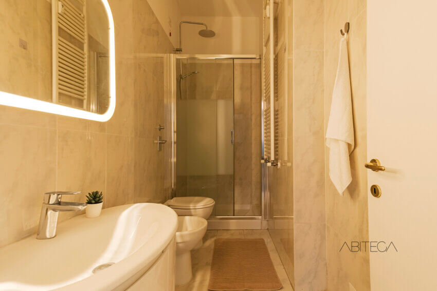 Il bagno si presenta in ottime condizioni e con un allestimento moderno che include un box doccia a tutta larghezza sullo sfondo.