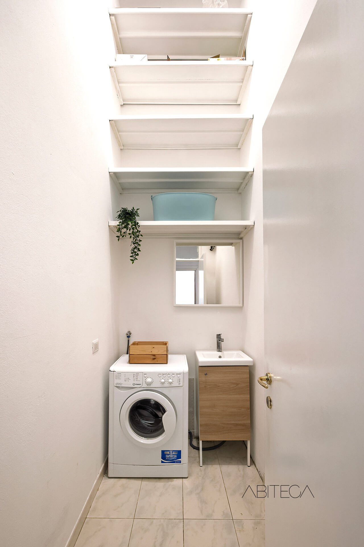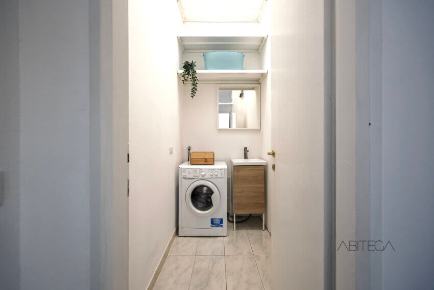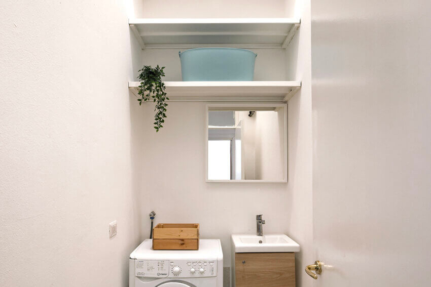 Infine la stanza ripostiglio/lavanderia ottimizza gli spazi con una scaffalatura molto estesa in altezza, una lavatrice e anche un lavabo. Come potete vedere questa casa risolve tutte le esigenze di spazio e stoccaggio che spesso mancano nei loft “puri”.