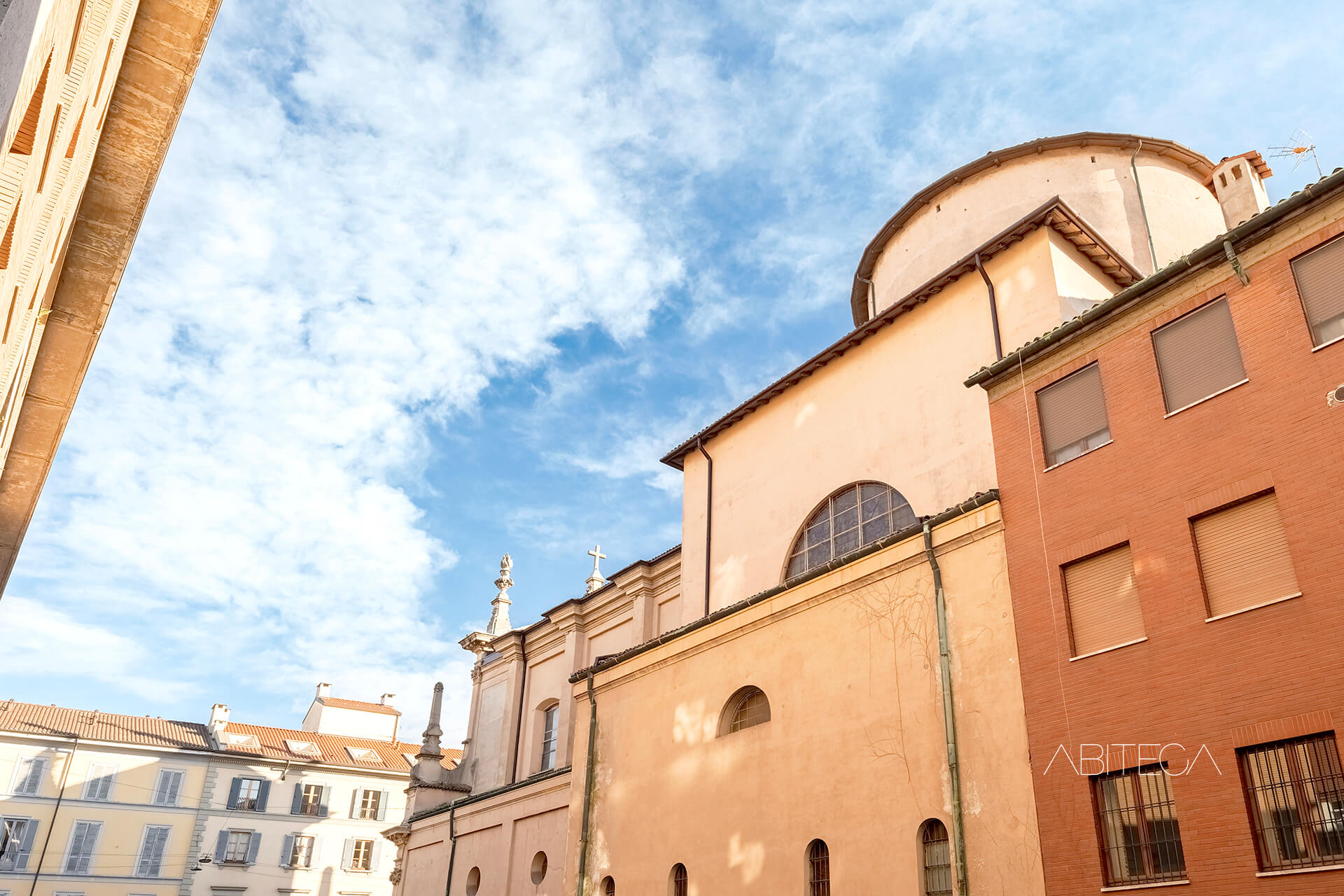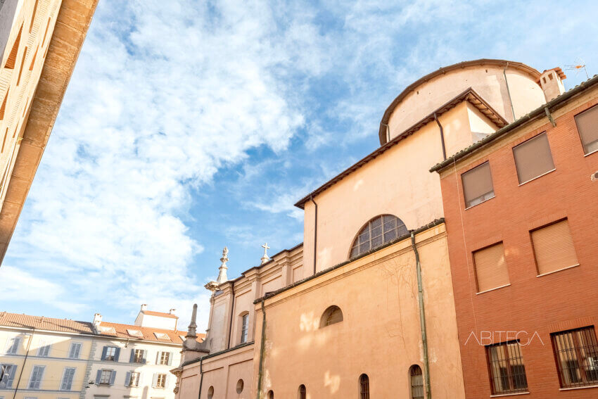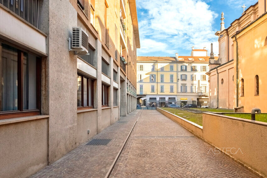 1) La casa si affaccia completamente all’interno dell’area cortilizia, con la vista sul verde condominiale e sul fianco della Chiesa di San Gottardo al Corso (direttamente confinante con il condominio). Siamo nel cuore dei Navigli in una posizione tranquilla e riservata rispetto a tante case che si affacciano direttamente sulla strada.